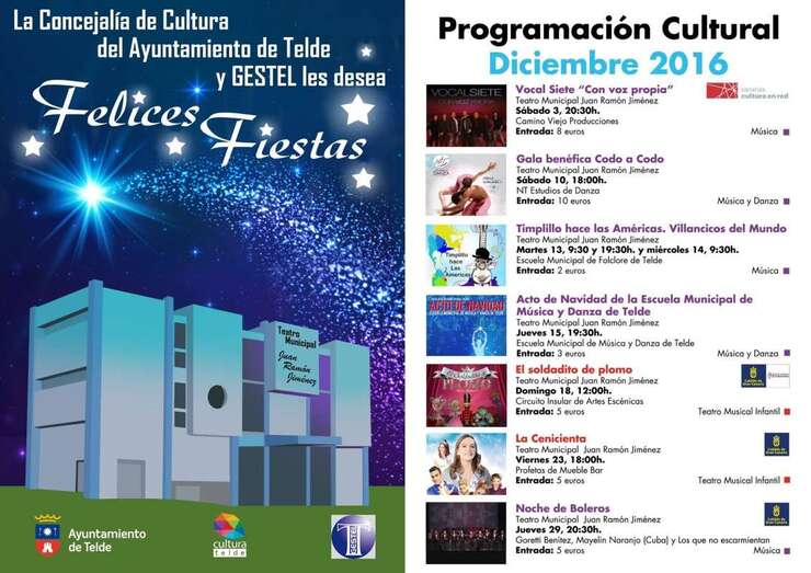 Telde.- La música  y el teatro infantil copan la programación que para el mes de diciembre ha elaborado la Concejalía de Cultura del Ayuntamiento de Telde. El área que dirige la nacionalista Marta Hernández ha previsto un total de 9 eventos musicales, danza y teatro infantil que se desarrollarán entre el 1 y 29 de diciembre. Todos los actos menos uno tendrán lugar como marco el Teatro Municipal. TA ofrece el programa.