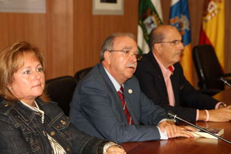 Acompañan en la mesa de presentación las siguientes personalidades: doña Ana Hernández Rodríguez, Concejala de Economía y Hacienda, Contratación, Patrimonio y Archivo Histórico. Don Juan Rafael Caballero Lozano, Concejal de Cultura. Don Pedro Socorro, Cronista Oficial de Santa Brígida y a cargo de la presentación del libro, su autor, Don Rafael Sánchez Valerón.