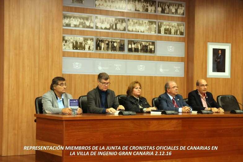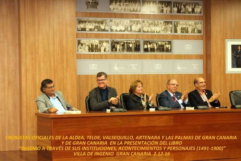 Con la asistencia del Alcalde de la Villa de Ingenio, Juan Díaz Sánchez, que expresa la bienvenida a los Cronistas Oficiales de los municipios de la isla representados: Presidente de la Junta de Cronistas Oficiales de Canarias y Cronista de Artenara, don José Antonio Luján Henríquez. Cronista Oficial de La Aldea de San Nicolás, don Francisco Suárez Moreno. Cronista Oficial de Valsequillo de Gran Canaria, doña María Teresa Cabrera Ortega. Cronista Oficial de Telde, don Antonio María González Padrón, y Cronista Oficial de las Palmas de Gran Canaria y Gran Canaria, don Juan José Laforet Hernández. Cronista de Santa Brígida y presentador del libro, don Pedro Socorro Santana. Editor del libro, don Jorge A. Liria Rodríguez, de Beginbook Ediciones Humanidades 5. La Asociación de Coros y Danzas de Ingenio que están presentes en este acto y ofrecen una muestra de su buen hacer en bailes folclóricos canarios.