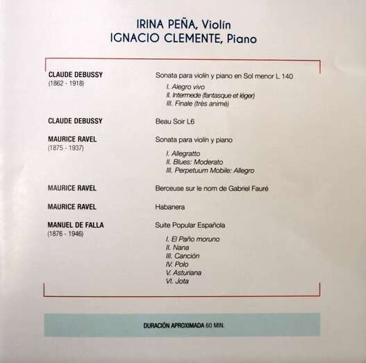 Un extraordinario y selecto repertorio magnificamente interpretado por ambos solistas instrumentistas sobre el escenario del Auditorio de la Villa Mariana de Teror, que abren con obras de compositores como Debussy y Ravel dos de las figuras más importantes de la música impresionista. Del compositor francés Claude Debussy (1862-1918), la última compuesta en 1917, poco antes de fallecer, Sonata para violín y piano en Sol menor L 140 (I. Allegro vivo II. Intermede fantasque et léger. III Finale trés animé), y Beau Soir L 6. De Maurice Ravel (1875-1937) Sonata para violín y piano Nº 1. Berceuse sur le nom de Gabriel Fauré, obra compuesta en 1922. Habanera. Del compositor español Manuel de Falla (1876-1946) Suite Popular Española (I El Paño moruno. II Nana. III Canción. IV Polo. V Asturiana. VI Jota). En el agradecimiento de Irina e Ignacio por la calurosa ovación recibida por su excelente actuación dedicaron un bis, la Nana de Sevilla, preciosa composición armonizada por el poeta y dramaturgo granadino, Federico García Lorca.