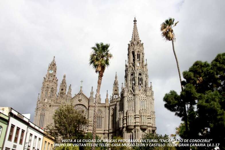 La Casa Museo León y Castillo de Telde dependiente de la Red de Casas Museo del Cabildo de Gran Canaria en su programa cultural “Encantado de Conocerle”, después del éxito de asistencia de público obtenido en el último trimestre de 2016, y en anteriores visitas a las localidades de Valsequillo, Gáldar y Agüimes, en la que se visitaron los emblemáticos recintos del patrimonio histórico artístico de estos lugares que conforman la geografía cultural isleña, la mañana del sábado 14 de enero de 2017, enmarcado en el mismo programa, el grupo de 120 visitantes que desde Telde fueron conducidos en dos guaguas a la norteña ciudad de Arucas, con la oportunidad de recibir la información directa y bien documentada del Cronista Oficial de la Ciudad de Telde, Antonio María González Padrón, Alicia Hernández Padrón, Técnica de la Concejalía de Cultura del Ayuntamiento de Arucas y Licenciada en Historia del Arte, y de David Cabrera, técnico de Turismo del Ayuntamiento de Arucas.