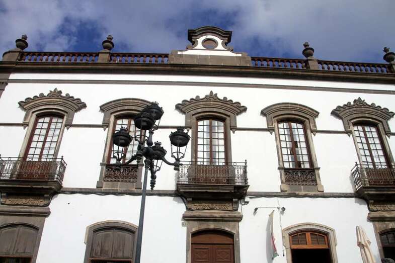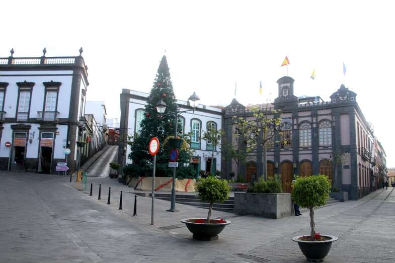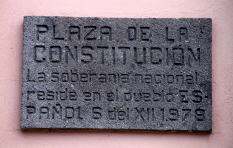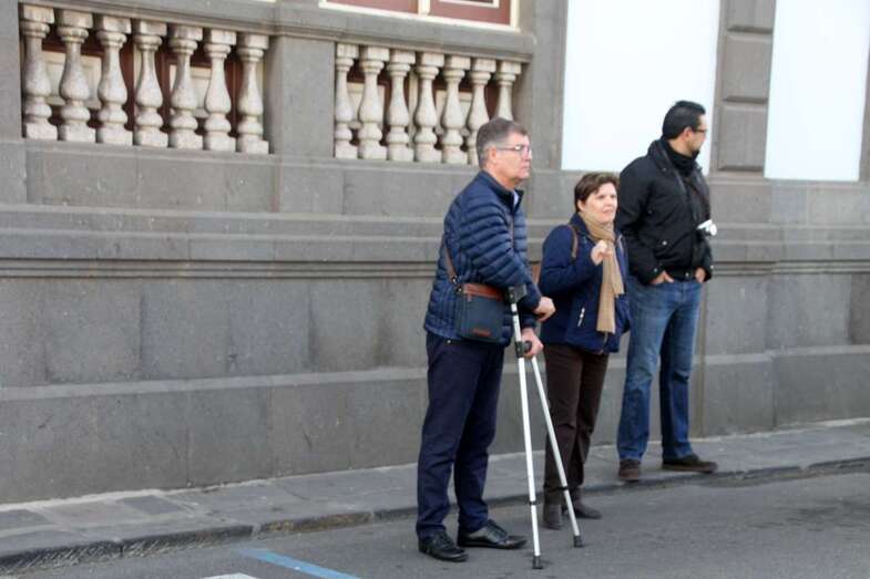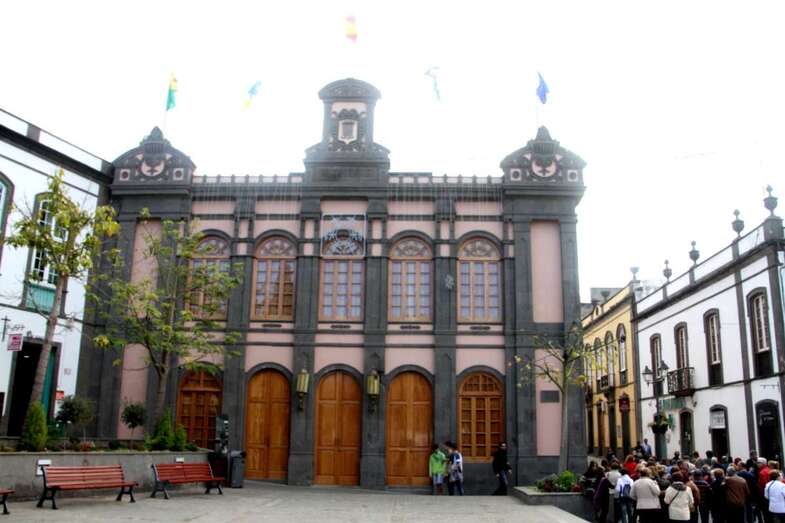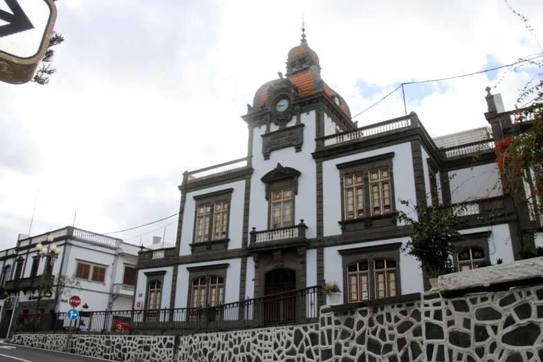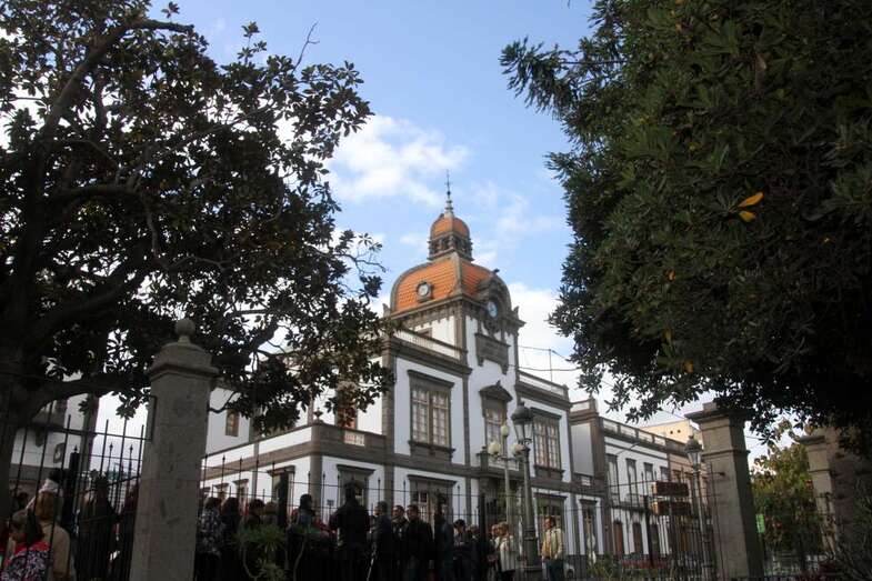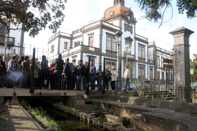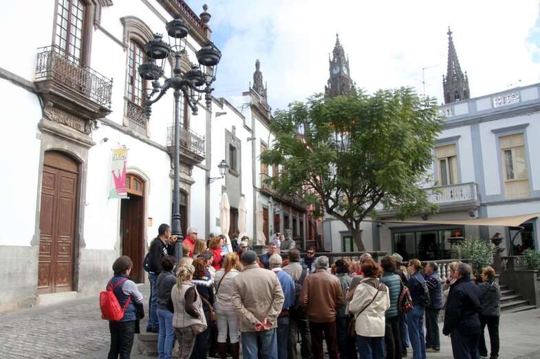 David Cabrera imparte la historia de los labrantes y su trabajo sobre las canteras y la piedra ya cortada tratando las medidas con la justa precisión para el encaje perfecto y armónico de los diseños requeridos para esta arquitectura. Llegados a la Plaza de la Constitución y frente al edificio del Ayuntamiento del año 1875, aunque Arucas tiene Ayuntamiento propio desde el año 1813, después de las Cortes de Cádiz. Con el tiempo el centro neurálgico de la ciudad se fija en la actual Plaza de La Constitución, y equidistantes los tres poderes de la ciudad, el poder religioso en la iglesia, el poder civil en el Ayuntamiento y el poder económico, la Heredad de Aguas. A principios del siglo XX se instala el primer mercado de las islas orientales, actualmente cerrado y en proyecto su futura utilización. La fachada del Ayuntamiento muestra una grieta ocasionada por un disparo de cañón durante la Guerra Civil. Por instancias del Cronista de Telde, el público visitante dedica un aplauso unánime a la Constitución Española que toma el nombre de esta plaza aruquense.