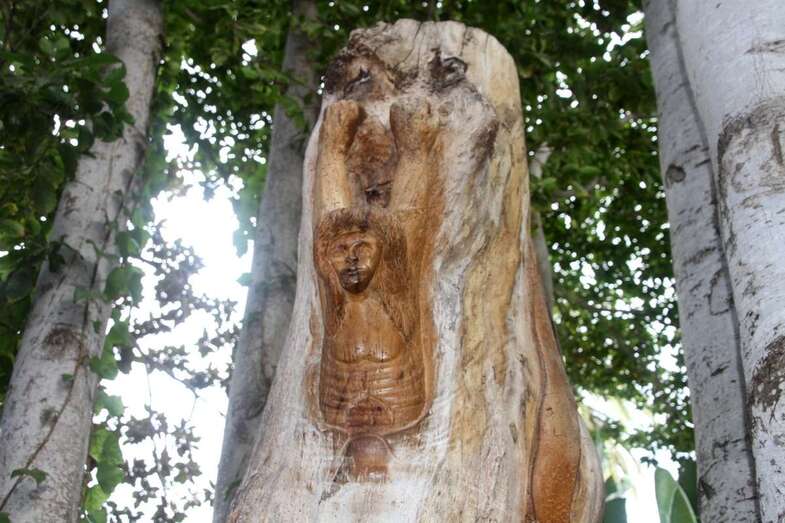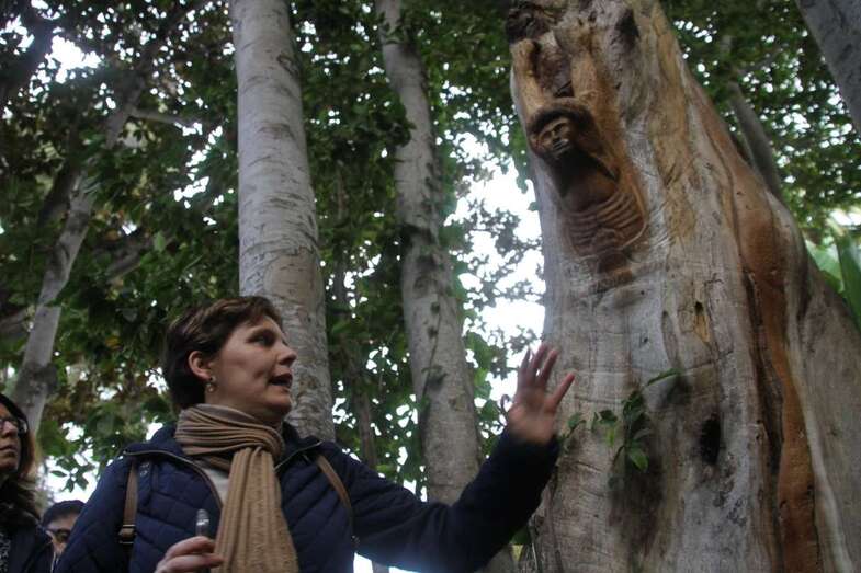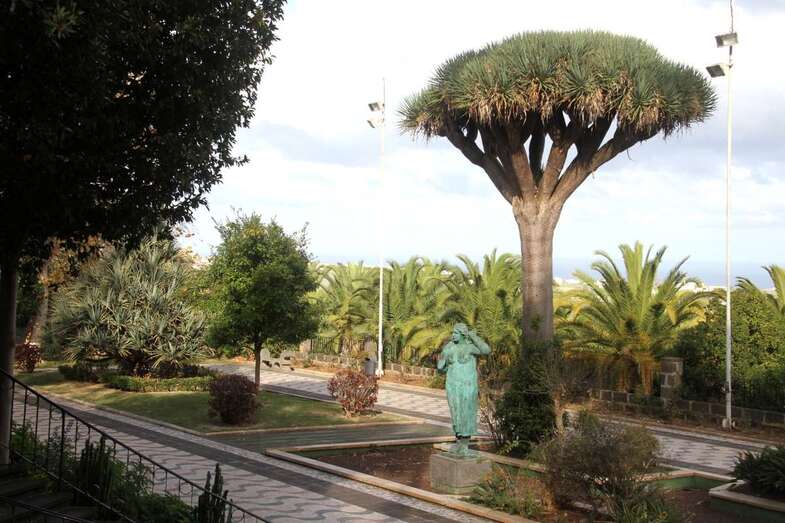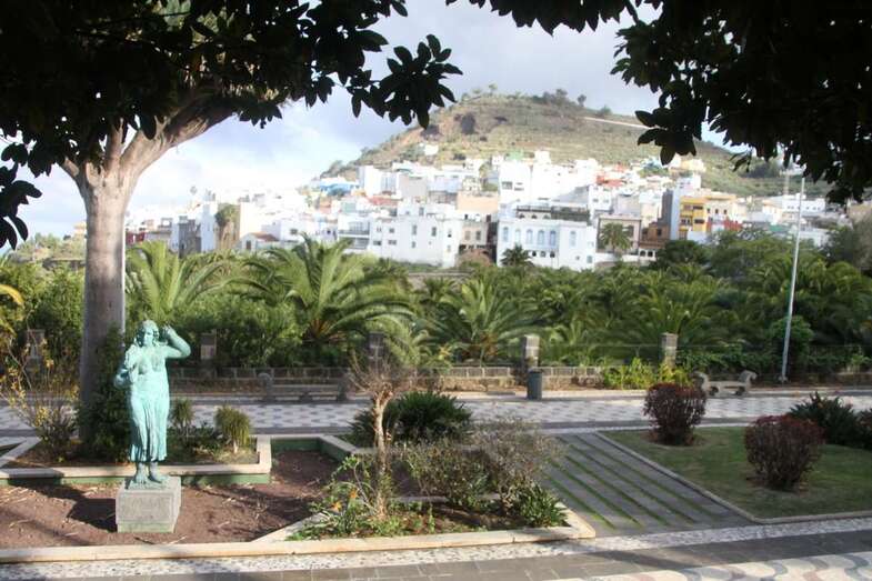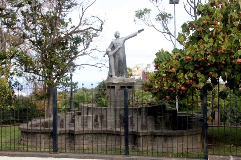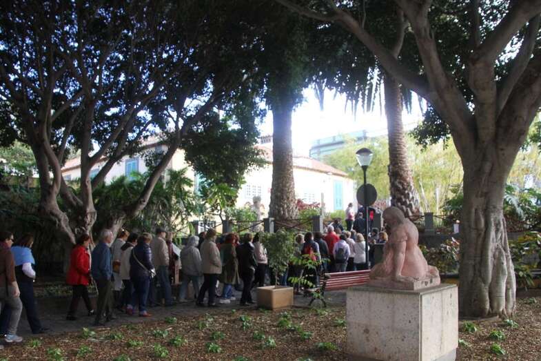 Tras el enrejado que cubre los jardines municipales, Parque Nuevo o de las flores, de estilo francés, diseñado para ser visto, en torno a la calle de La Heredad, un precioso parque que en este tramo llega hasta el Museo Municipal. A la entrada se levanta un monumento dedicado a San Juan Bautista de La Salle, hermanos religiosos traídos por la burguesía hasta aquí para dedicarse a la formación de los jóvenes. Descripciones de esta ruta urbana que los informadores guías de esta visita, Alicia Hernández y David Cabrera, detallan con ciertas curiosidades, como la talla que sobre los restos del tronco de un tilo muerto ha esculpido hace años, formando parte de la laurisilva, el escultor aruquense Antonio Rodríguez, quedando como un misterio la escultura en madera dada a la fantasía, como el relato infantil de un duende que durante la noche envuelve este parque. Al pie del tronco madre que muere y da vida a los hijos que nacen y crecen al pié del hermoso árbol, allí la escultura del duende permanece como un elemento natural más del frondoso parque de Arucas.