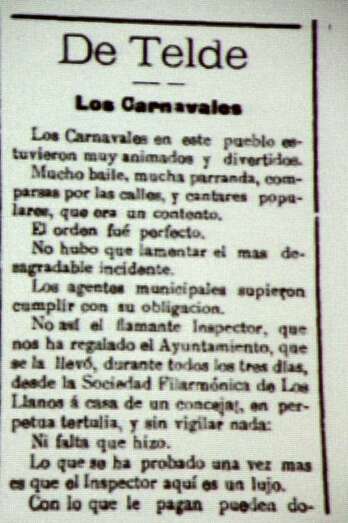 Noticias en prensa, periódicos de la época, hay varios, en los que se habla de estas fiestas de carnaval a finales del XIX, en 1880, 1890, el Ómnibus, El Liberal. De los de 1913, donde hablan de Telde como una ciudad muy carnavalera, “se celebró el carnaval en el pueblo de Telde, todo muy bien dentro del orden, estricta disciplina, las personas del lugar se portaron bien, no hubo trabajo para los dos guardias municipales, pero no obstante, ellos diligentes estuvieron al cuidado de que no sucediera nada, al que no se le vio fue al inspector”. En otra noticia describen: “Los carnavales de Telde, en este pueblo estuvieron muy animados, divertidos, mucho baile, mucha parranda, comparsas por las calles, cantares populares, todo un contento”. Nos hablan así hasta el año 1936, después no se habla nada hasta el año 1942, a partir de aquí las noticias son muy discretas tales como “Bailes en Telde”. A partir de 1955 Fiestas de Invierno. Fueron famosas las Bandas de Música en Telde, sagas de gremios y familiares como los Falcón. A partir de entonces la sociedad va cambiando en sus formas de vida, progresando y caminando por la democracia recién estrenada, y por sus ámbitos sociales adaptándose igualmente en sus manifestaciones, una de ellas el Carnaval.
