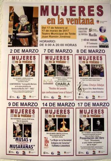 La Exposición Colectiva de Pintura, “Mujeres en la Ventana, Murillo y Otras Musas” inaugurada la noche del viernes 17 de febrero, en la Sala de Exposiciones del Centro Cultural, Teatro Juan Ramón Jiménez de Telde, en conmemoración del IV centenario del nacimiento del gran pintor del Barroco español, artista conocido dentro y fuera de España y personalidad central de la Escuela Sevillana. El pintor de las Inmaculadas, que forman parte de las obras de carácter e iconografía religiosa dedicadas a ser expuestas en iglesias y conventos, manteniendo su maestría en otras obras de género profano, destacando los motivos infantiles, retratos, etc. Su escuela dio origen a un numeroso grupo de seguidores y discípulos.