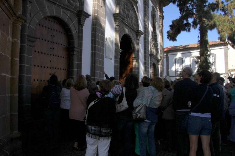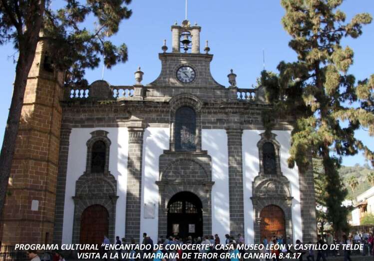 La Casa Museo León y Castillo de Telde dependiente de la Red de Casas Museo del Cabildo de Gran Canaria en su programa cultural “Encantado de Conocerte”, continua con el éxito de asistencia de público obtenido en las anteriores visitas a las ciudades de Valsequillo, Gáldar, Agüimes, Arucas, Ingenio y Santa Brígida. Esta vez con la inscripción de 140 personas, la mañana del sábado 8 de abril se realizó la visita cultural a la Villa Mariana de Teror. Recorrido que se inició a las puertas de La Alameda, trasera de la Basílica de Nuestra Señora del Pino en el núcleo patrimonial histórico artístico, donde fuimos recibidos por el historiador don Gustavo A. Trujillo Yánez, autor de un interesante estudio e investigación sobre las devociones a la Virgen del Pino a través de la historia, basadas en el legado de los manuscritos recopilados del franciscano Fray Diego Henríquez, con el título: Verdadera Fortuna de las Canarias y breve noticia de la milagrosa imagen de Nuestra Señora del Pino de Gran Canaria 1714, dedicado a la misma reina de los cielos y tierra del R.P. Franciscano, Diego Henríquez Minorita hijo de la Provincia de Sant Diego de Canaria.