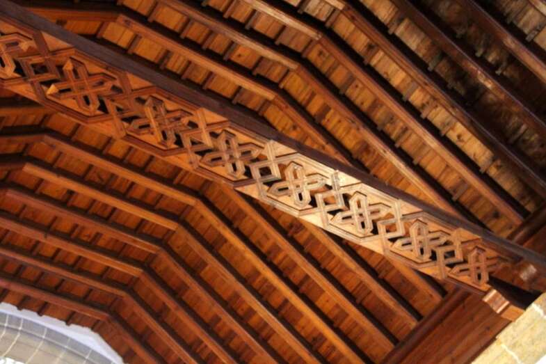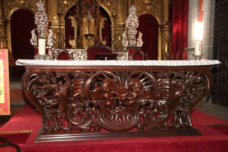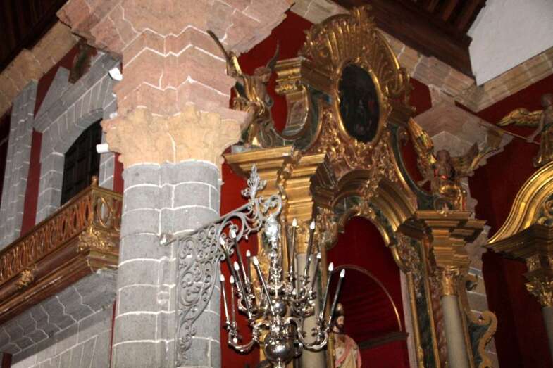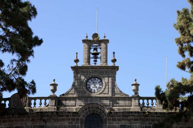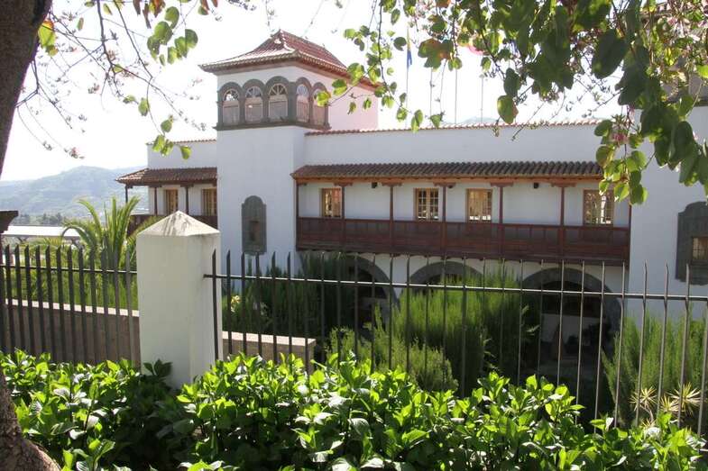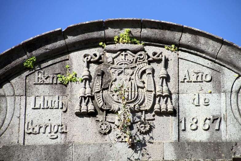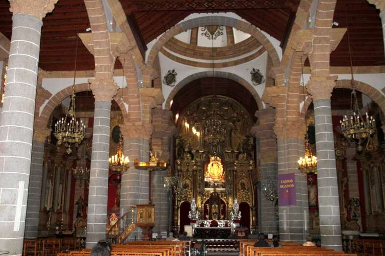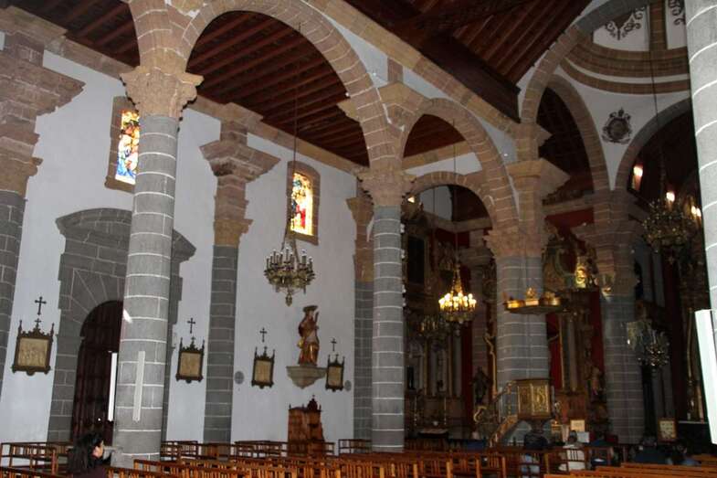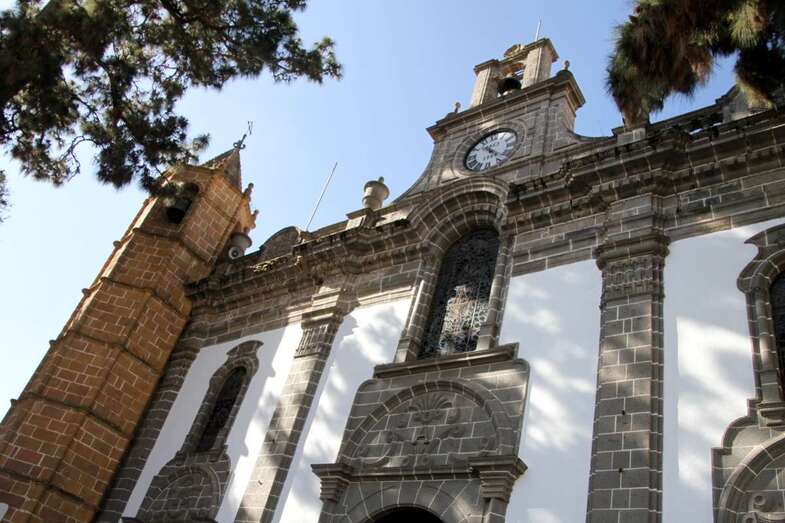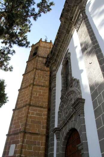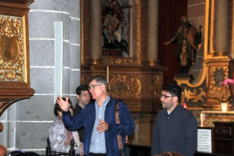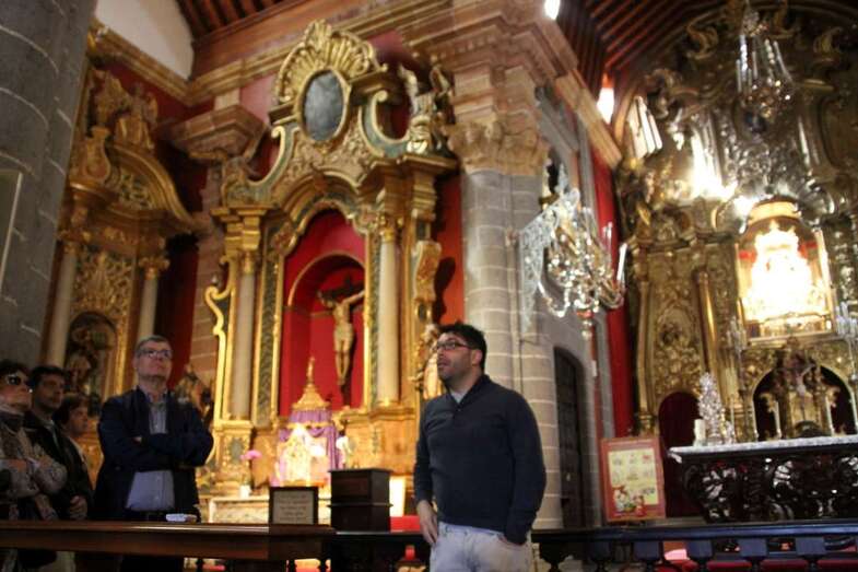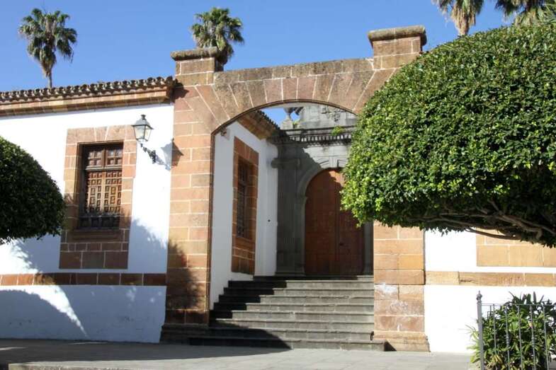 En el casco histórico de Teror nos guía el historiador Gustavo A. Trujillo Yánez, ante el Paseo de la Alameda, posterior de la Basílica de Nuestra Señora del Pino y frente al Palacio Episcopal, residencia de verano del obispo, donde se aprecia en la portada de acceso sobre el arco de entrada labrado en cantería de Teror, el escudo del Obispo Lluch y Garriga, entrada que cumple ahora 150 años, construida en 1867. La torre de la fachada de la Basílica, llamada torre amarilla por estar construida en sillares con ese tipo de piedra. Hubo canterías de piedra gris, así como familias de canteros que se dedicaron a esta labor en Teror. Uno de los obispos que más tiempo estuvo en Teror y fomentó mucho la devoción a la Virgen del Pino fue Monseñor Antonio Pildain Zapiain, desde 1936. Hizo venir a Canarias al futuro Papa Pío XII que se quedó admirado de la religiosidad de los canarios hacia la Virgen del Pino, al que se le recuerda en una placa en la fachada de la Basílica en la que se lee: “En este Santuario-Basílica a los pies de Nuestra Señora del Pino el día 29 de octubre de 1934 oró el EMMO. Cardenal E. Paccelli hoy Su Santidad Papa Pío XII. Teror, 8 de septiembre 1939”.