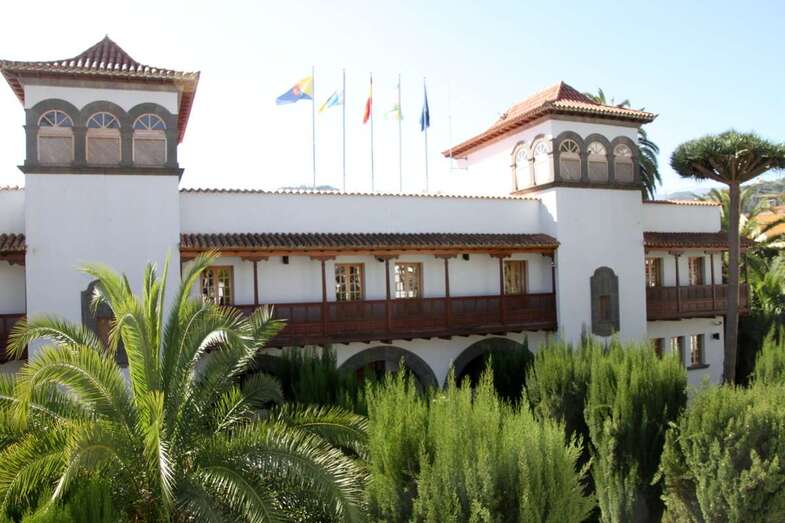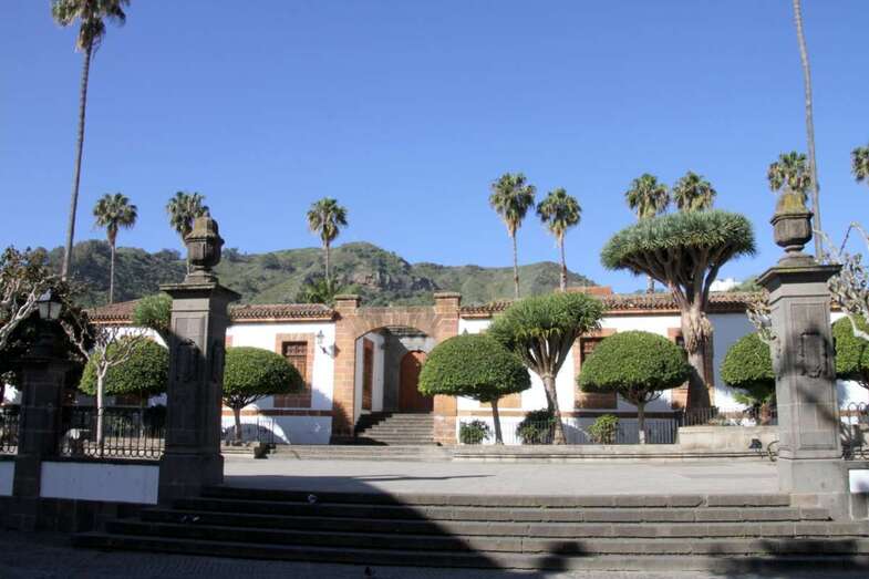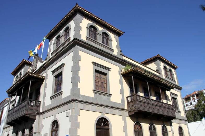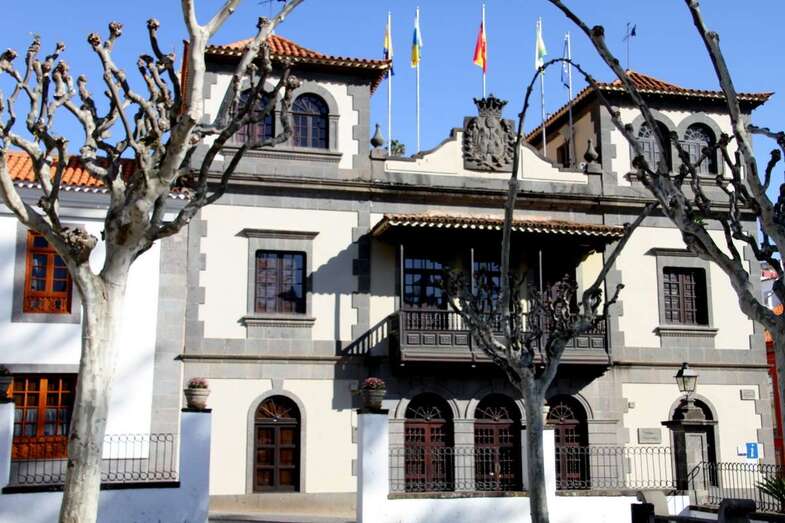 Ante la fachada de la antigua sede del Ayuntamiento de Teror, desde hace dos años las oficinas consistoriales están en el antiguo colegio de los Salesianos a la entrada del pueblo, aunque en aquel edificio se siguen celebrando los Plenos. En origen la planta baja ocupó las funciones de Pósito, como granero público, luego fue escuela, y más tarde paso a ser Ayuntamiento. La segunda planta se le añade en los años cuarenta coronada por el primer escudo que tuvo el Ayuntamiento de Teror, del año 1916, sobre el que vemos reflejado dos símbolos básicos para Teror: el Pino, árbol simbólico de Teror y en su copa el monograma de la Virgen María, y en la parte baja la antigua fachada de la Fuente Agria. Hay un refrán popular que dice: De Teror la Virgen y el Agua Agria. Izadas las banderas entre ellas las del Municipio, el color blanco que simboliza el blanco de las casas, el verde de la vegetación y el color amarillo referencia a la piedra de cantería de este color.