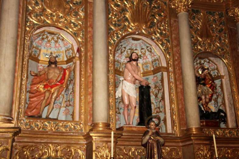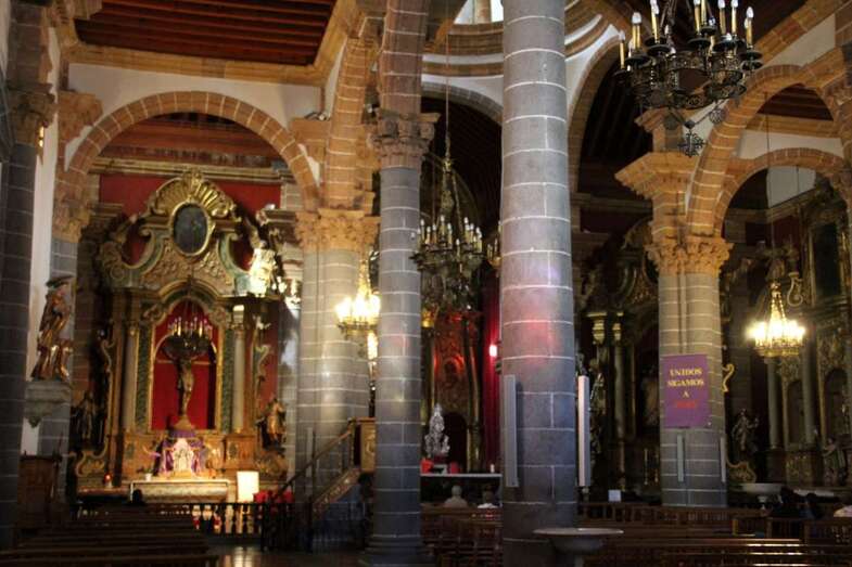 En la Basílica del Pino la gente de Telde puso su mano y esfuerzo, colaborando en su construcción. El Vía Crucis es de la misma factura que el que se muestra en la Iglesia de San Gregorio Taumaturgo de Los Llanos, se trajo en el mismo año, el de San Gregorio es policromado y el del Pino  imitando el mármol, aunque son de escayola. El púlpito le cabe la gloria, porque el de San Gregorio como el de San Juan de Telde que eran de caoba, se estropearon, pero en el de la Basílica del Pino predicó Antonio María Claret, sacerdote que llega a Canarias en 1848 de la mano del recién creado obispo canariense, el Padre Codina, cuyo cuerpo incorrupto se encuentra en la Catedral de Santa Ana. Antonio María Claret  a quien llamaban Padrito, misionando en Gran Canaria creó la Orden de los Misioneros del Sagrado Corazón de María, conocidos como Claretianos, extendidos por todo el mundo. Él reconoce que a los pies de la Virgen del Pino le vino la inspiración para crear esa nueva Orden sacerdotal. Se muestra la imagen de San Luis Gonzaga de familia aristócrata italiana, murió joven. Una talla del defensor de la Eucaristía, San Pascual Bailón, con la Sagrada Forma; una bella imagen del Cristo Resucitado, y pintura de las llamadas de Ánimas, muy de culto especial en Canarias.