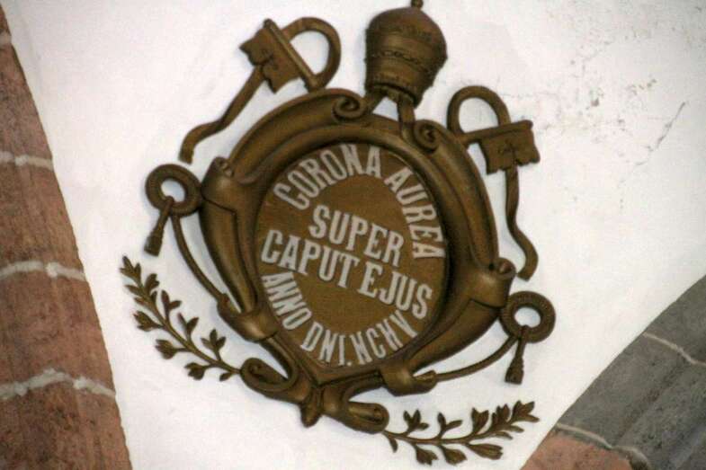 Numerosas placas conmemorativas, escudos heráldicos,  destacan las efemérides religiosas y sociales recordando a próceres de la Villa y nombramientos como la dedicada a la visita del Cardenal Paccelli, Papa Pío XII, que conmemora el Centenario (1905-2005) de la coronación canónicamente de la imagen de la Virgen del Pino por el Obispo Padre Cueto. En el arco frontal bajo la cúpula sobre el presbiterio, en los laterales las inscripciones dedicadas a la Patrona Diócesis Canariensis Anno MCMXIV, y el de la Corona Aurea Super Caput Ejus Anno DNI MCMV. En el exterior placa labrada en piedra roja con la leyenda de la colocación del templo el año de 1767, la Casa de los Patronos de la Virgen; la dedicada a D. Agustín Manrique de Lara. La casa donde nació el periodista y escritor terorense D. Carlos Guillermo Domínguez Hernández (1925). A lo largo de este núcleo central de la Villa de Teror cuelgan de las farolas los nombres y escudos municipales dedicados a los Municipios de Gran Canaria.