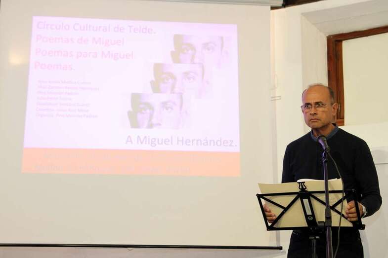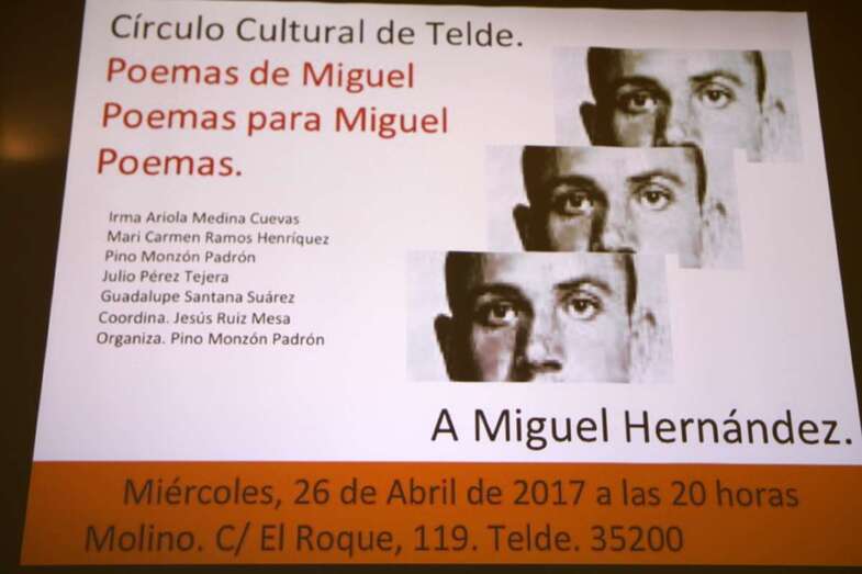 Como en otro homenaje dedicado en octubre de 2010 por el Círculo Cultural de Telde, al hombre comprometido social y políticamente con su tiempo, su poesía y sus ideales, el presidente de esta entidad social, Máximo Riol Cimas en la presentación de este acto expuso: “El Círculo Cultural de Telde homenajeó a Miguel Hernández en la Biblioteca del Parque Municipal Arnao con motivo del primer centenario de su nacimiento. Hoy hemos querido volver a homenajear a este magnífico poeta y dramaturgo que murió en la mañana del 28 de marzo de 1942 después de sufrir diferentes traslados por cárceles franquistas. Jesús Ruiz Mesa presentará el video realizado por don Ildefonso Rodríguez Ramírez, con narración y recitados de poemas por Julio Pérez Tejera.