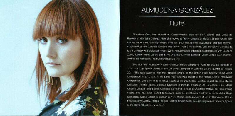 Almudena González realiza estudios en Málaga, y en el Conservatorio Superior de Granada, Liceu de Barcelona y en el Trinity College of Music bajo las becas “Trinity Trust” y “Cordelia Moses” con profesores como Sue Thomas, Wissam Boustany, Julia Gallego. Perfecciona sus estudios en Colonia con Robert Winn y en Barcelona finalizando su Máster en solista con Vicent Prats en la ESMUC. Realiza Master Classes y cursos con Jacques Zoom, Juliete Hurel, Andrea Lieberknetch, Philip Bernold, entre otros. Ha sido galardonada en numerosos concursos. Almudena ha sido invitada a Festivales. Muchas gracias”.