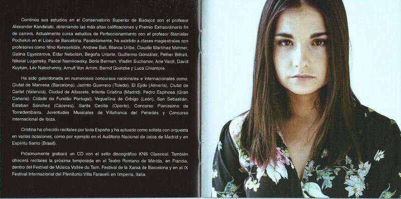 La pianista Cristina Naranjo nace en Las Palmas de Gran Canaria en 1990. Estudia en el Conservatorio Profesional de Las Palmas de Gran Canaria finalizando en 2006 con Premio Fin de Grado. Continúa su formación en el Conservatorio Superior de Badajoz obteniendo las más altas calificaciones y Premio Extraordinario fin de carrera. Actualmente cursa estudios de Perfeccionamiento con el profesor Stanislav Pochekin, en el Liceu de Barcelona y asiste a clases magistrales con profesores de reconocido prestigio.
