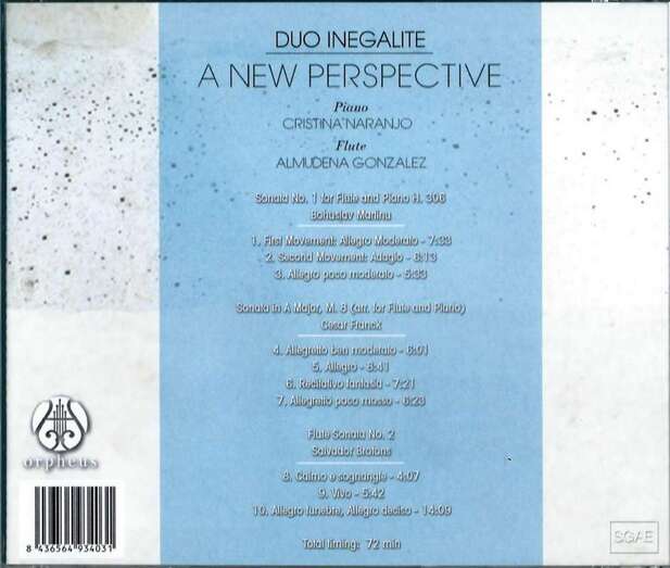 El trabajo discográfico que presentan titulado A New Perspective incluye estas composiciones para la Sonata nº 1, del compositor checo Bohuslav Martinu, en sus tres movimientos Allegro Moderato, Adagio y Allegro poco moderato. La Sonata en A Major, M.8 (arre. para flauta y piano) de César Franck, en sus cuatro movimientos, y del compositor catalán Salvador Brotons, la Sonata nº2, en los movimientos Calmo e sognangte, Vivo y Allegro fúnebre, allegro deciso. Al finalizar el concierto las concertistas firmaron su dedicatoria en el CD al público que adquirió su álbum grabado en 2016.