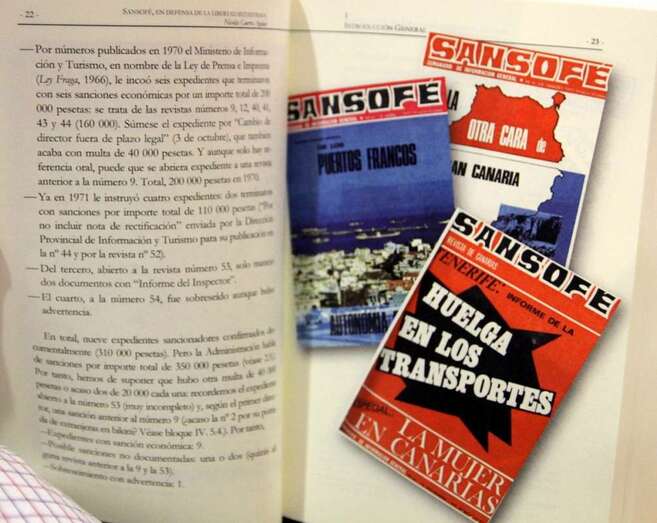 Quiero agradecerles a ustedes su presencia, reconforta, satisface, alegra, encontrarme tan maravillosamente acompañado en cuanto que nos une un elemento común que es lo fundamental de este libro, mi homenaje, nuestro homenaje. El homenaje que la sociedad canaria todavía les debe a todos aquellos componentes, hombres y mujeres de la Revista Sansofé, que haciendo una unidad en las ideas, en los planteamientos, aunque a veces con ciertas disparidades, con ciertas desavenencias, incluso, de tipo intelectual o de tipo ideológico, afín de cuentas estamos en las postrimerías del franquismo, celebraron para Canarias la llegada de una revista que era palabra, que era pensamiento, que era idea, una revista que siempre me recordó a aquellas que caminaban por las tierras peninsulares, como Cambio 16, como Gaceta Universitaria, Triunfo o como Cuadernos para el Diálogo, revistas de pensamiento. Pero con una sola arma, con un solo elemento en sus manos, hábilmente manejados. Eso, sí, la palabra, y frente a la palabra lo único que tuvieron fueron nueve expedientes administrativos, que al final lógicamente terminaron con la revista, aunque realmente terminaron con la empresa que editaba la revista.