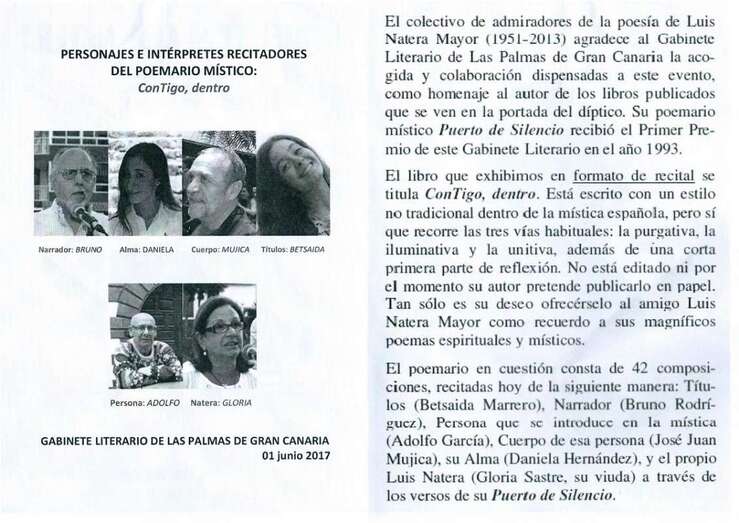Enhorabuena a todos los participantes, colaboradores y en especial a Adolfo García, por su trabajo, buen hacer y coordinación en el excelente recital que recordando a Luis Natera, en los  versos de su poema Puerto de Silencio, y en los del poemario inédito de Adolfo García, ConTigo, dentro, hemos recorrido los caminos y silencios siguiendo los ecos que, aún, gracias, resuenan por las estancias donde se le recuerda al poeta de la voz profunda de raíz mística, Luis Natera Mayor. Muchas gracias.