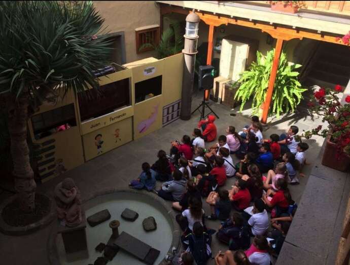 Patio con sabor secular, que cambió su cotidiana estampa íntima de silencios en complicidad con los objetos, testimonios de una época y enseres que se muestran en sus salas, hoy centro de reuniones, charlas, recitales, encuentros literarios, conferencias, conciertos y audiciones de cantautores, como viene mostrando el programa cultural de la Institución museística teldense, dependiente del Cabildo de Gran Canaria, para convertirse en un pequeño teatro infantil de títeres a través de un montaje que combina los recursos audiovisuales con la escenificación de los títeres, donde toman vida los protagonistas representados que ocuparon en su niñez estas estancias, los hermanos León y Castillo.