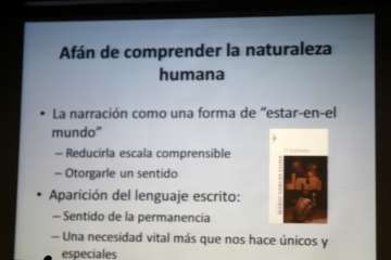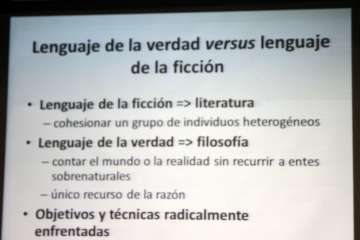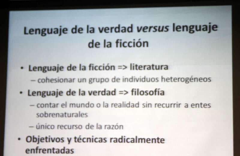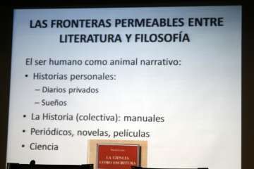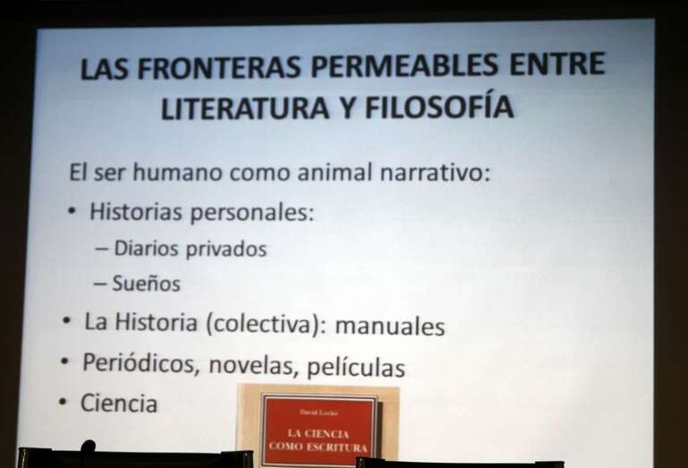 Una interesante e importante reflexión literaria para profundizar, conocer más y mejor los entresijos de la obra que hasta ahora en sus diferentes publicaciones, ha marcado la importancia de su posición intelectual resultado de la labor profesional, trabajo editorial y talento de este escritor que “sencillamente” involucra al lector a interesarse por los caminos de la filosofía en relación a la literatura y viceversa, como bien expuso en el inicio de su intervención del acto de presentación de su obra en la implicación del ser humano y la expresión oral y escrita en las fronteras permeables entre literatura y filosofía. Temas muy bien expuestos en la proyección que ayudó a su mejor comprensión el hecho de la relación literatura-filosofía con la mención de autores conocidos que abordaron dicha dicotomía: “En el afán de comprender la naturaleza humana, la narración es una forma de <<estar en el mundo>>, describimos historias personales, la historia como elemento colectivo de hechos narrados en medios de comunicación, prensa, novelas, películas, y Ciencia. La narración a escala comprensible, otorgarle un sentido. Desde la aparición del lenguaje escrito que da a dicha comunicación un sentido de permanencia y la necesidad vital que nos hace únicos y especiales. Conceptos de expresión literaria en el lenguaje de la ficción en la literatura, cohesionando un grupo de individuos heterogéneos. Lenguaje de la verdad, hacía la filosofía, contar el mundo o la realidad sin recurrir a entes sobrenaturales, y como único recurso de la razón. Objetivos y técnicas radicalmente enfrentadas”.