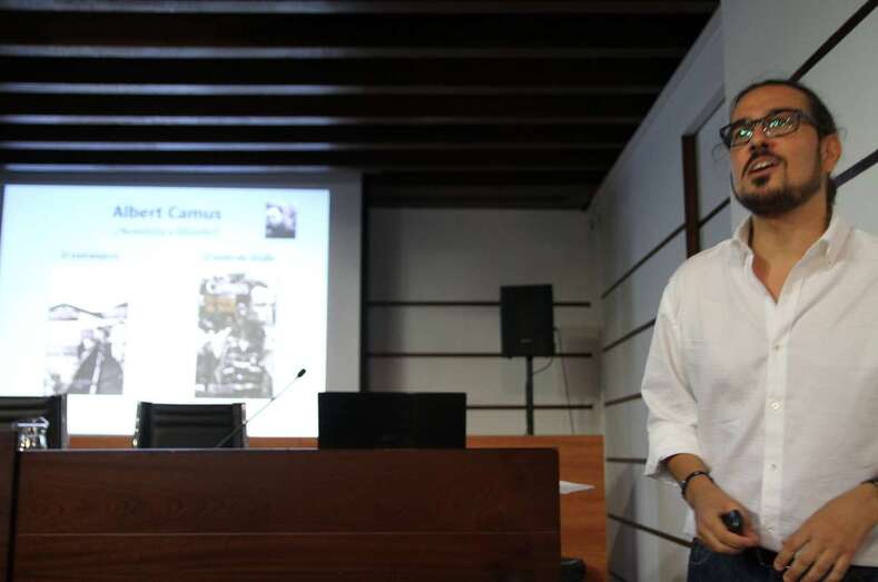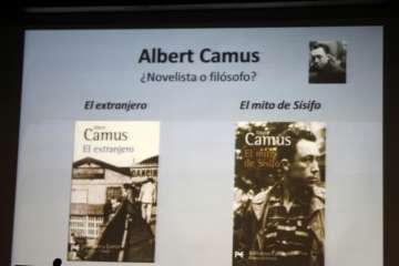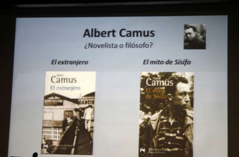 “En el caso de la novela El extranjero, de Camus, novela con hondo calado filosófico, de la época del existencialismo, un extranjero que se siente asimismo y para los demás, en la búsqueda de los sentidos propios del existencialismo, aunque plantea otra serie de cuestiones universales como la atrofia moral o falta de sensibilidad moral, la excesiva burocratización de las sociedades contemporáneas, en este concepto fue junto con Kafka de los que mejor tocaron estos temas, sobre preocupaciones existenciales. Al leer el libro de El mito de Sísifo, pasamos a la otra cara de la moneda, un ensayo escrito que se lee casi como una novela.