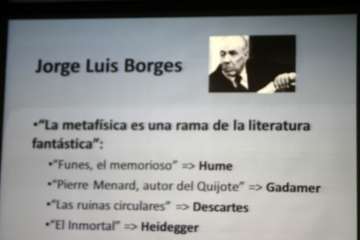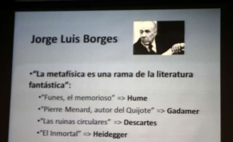 En el caso de Borges, ilustra con bastante claridad esa permeabilidad entre la filosofía y la literatura, tiene una definición de hecho sobre la filosofía con ciertas animadversiones de los puristas, y dice que <<la metafísica es una rama de la literatura fantástica>> Sin embargo Borges fue capaz de coger argumentos filosóficos y transformarlos en unos cuentos que le dieron fama mundial, Funes, el memorioso, con reminiscencias de la filosofía de Hume. Pierre Menard, autor del Quijote, con huellas de Gadamer. Las ruinas Circulares, la hipótesis del soñador soñado que recuerda a Descartes. Leyendo a Borges se entiende mejor a esos autores que leyendo sus propias obras.