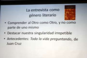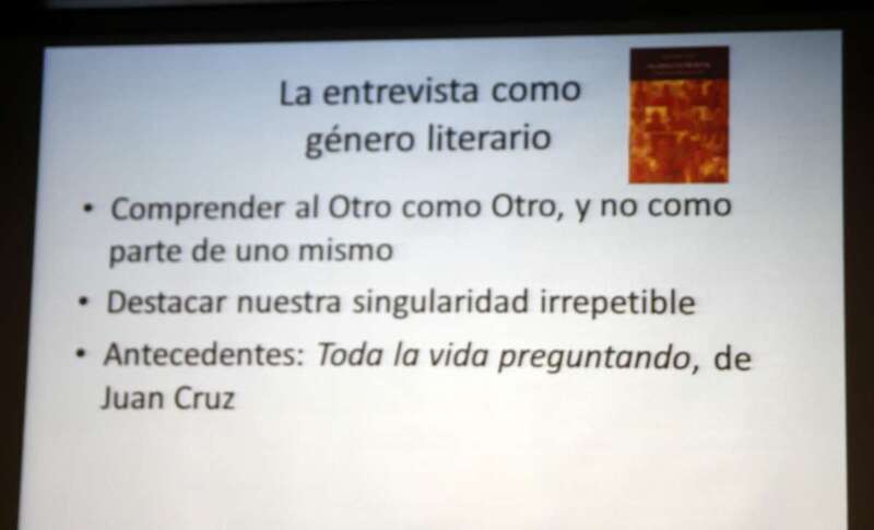 Aparte de estos textos me he dedicado a hacer entrevistas, un importante género que se debería reivindicar como literario, hay una filosofía detrás, un poco devaluado actualmente por los medios de comunicación, quizás por la propia premura de la noticia. Hay una necesidad de comprender al Otro como Otro, y no como parte de uno mismo, destacando nuestra singularidad irrepetible, resaltando la enseñanza de Sócrates que <<solo se puede acceder a la verdad a través de la oralidad>>, del diálogo abierto de preguntas y respuestas. Un antecedente para escribir mi libro fue la obra Toda la vida preguntando, del periodista y escritor Juan Cruz”.