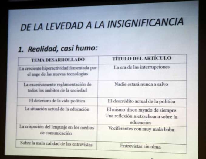 La Levedad acude a la caducidad, a la fugacidad y a nuestra condición de fantasmas y la Insignificancia, al anonimato, a la invisibilidad y a la homogeneización del individuo, de ahí que sea este título de mi obra: “De la Levedad a la Insignificancia” y como subtítulo Propuestas para pensar el presente, es otro indisimulado homenaje a las Seis propuestas para el próximo milenio, de Italo Calvino. Muchos autores que llenan el panorama intelectual de la relación o permeabilidad entre literatura y filosofía, donde mis textos participan de unos y de otro, de tal forma que para los filósofos mis textos son demasiado literarios, y para los novelistas mis textos son demasiado filosóficos.