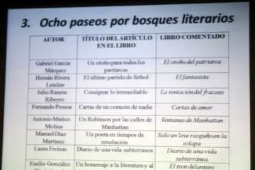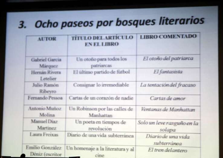 Rubén finaliza su interesantísima exposición con los temas de referencia y títulos que incluye en su libro: Apuntes sobre libros y autores y Ocho paseos por bosques literarios, destacados escritores como Fernando Pessoa, Juan Ramón Ribeyro, Julio Cortázar, Ricardo Piglia, Borges, Onetti, Elvira Lindo, Gabriel García Márquez, Hernán Rivera Letelier, Antonio Muñoz Molina, Laura Freixas, Manuel Díaz Martínez, Emilio González Déniz, estos dos escritores se encontraban presentes en este acto. Una última sección de esta nueva obra se refiere a las Crónicas sobre cine. En una reflexión sobre la Trastienda del escritor, la “vocación” es una “elección”. Escribir es lo mejor que le ha pasado y puede pasarle a un escritor.