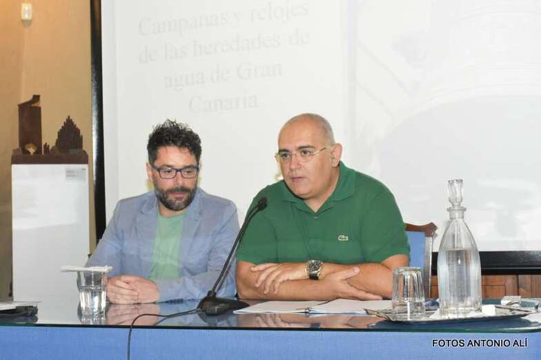 El ponente brindó un recorrido histórico por diferentes templos y heredades de agua, analizando sus piezas y artilugios. Entre ellos, destacó la campana adquirida por la Heredad de la Vega Mayor de Telde en 1825 para la parroquia de San Juan Bautista de Telde, así como el reloj que en 1812 donó el Cabildo Catedral para ser instalado en el mismo templo.