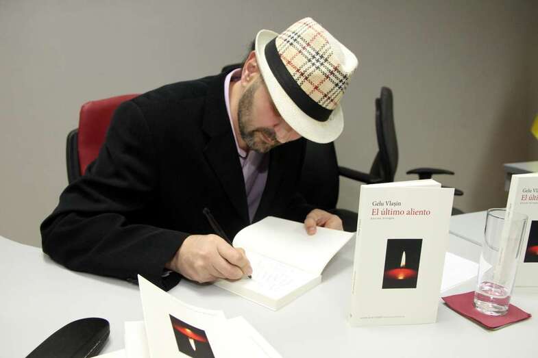 Gelu Vlasin finaliza su intervención con el recitado, en rumano y español, de dos poemas: La mano (mâna), y los versos que dan título al poemario, El último aliento (ultima suflare), con el agradecimiento por la presentación y asistencia, el poeta firma ejemplares de su obra a los interesados del poemario El Último Aliento.