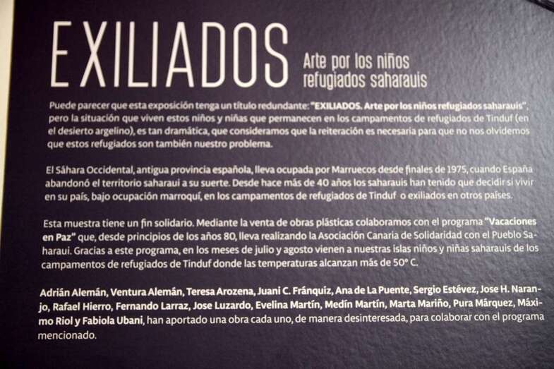Interviene la Comisaria y organizadora de la Exposición Exiliados, Juani Fránquiz: “Esta exposición, Exiliados Arte por los Niños Refugiados Saharauis, tiene como objetivo colaborar económicamente mediante la venta de obras plásticas con el programa solidario Vacaciones en Paz. Contamos con estas obras gracias a la generosidad de Adrián Alemán, Ventura Alemán, Teresa Arozena, Ana de la Puente, Sergio Estévez, José H. Naranjo, Rafael Hierro, Fernando Larraz, José Luzardo, Evelina Martín, Medín Martín, Marta Mariño, Pura Márquez, Máximo Riol, y Fabiola Ubani. Quienes desde un principio hicieron suyo el proyecto manifestando su total apoyo y solidaridad a los refugiados saharauis.