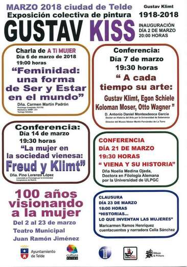 Actos comprendidos en el programa de actividades culturales de la Concejalía de Cultura, Gestel y Cultura Telde del M. I. Ayuntamiento de Telde, para el primer trimestre de 2018, y en el transcurso de la Exposición Colectiva de pintura Gustav Kiss 100 Años Visionando a la Mujer, dedicada a la obra del artista austríaco Gustav Klimt (Baumgarten, Viena, 1862-1918), organizada por la Escuela de Dibujo y Pintura del profesor José Sosa Serván de Telde, no sólo la opción de visitar la muestra con el fin de conocer a pintores universales que han marcado el desarrollo artístico mundial y sus obras, que, como legado desde colecciones privadas y permanentes, se exhiben en los museos internacionales más conocidos, sino tomar parte en las diversas ponencias que se imparten en referencia a tomar conciencia del artista y su época, su escenario biográfico, social y artístico, con las influencias y puntualizaciones relacionadas con sus cuadros y el lugar destacado que alcanzaron en el universo del arte.