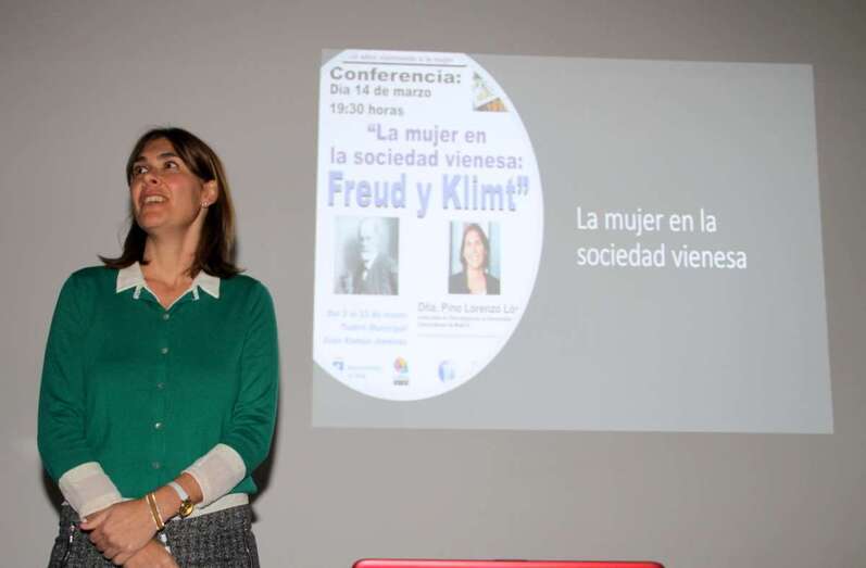 La tarde del miércoles 14 de marzo, doña Pino Lorenzo López, Licenciada en Psicología por la Universidad Complutense de Madrid, psicoanalista por la Escuela de Psicoanálisis Grupo Cero, impartió en el salón de actos del teatro Juan Ramón Jiménez, la conferencia “La mujer en la sociedad vienesa: Freud y Klimt”. En el contexto histórico, social, político y económico de la Europa de finales del siglo XIX, aún se dejaban notar las influencias de una época que se regía por unos dogmas y formas de vida en los que la carencia de libertad, moral rigurosa, temores a lo que significara transgredir esas normas, en la mujer se acusaba la diferencia de valores, el permanecer en un segundo plano con respecto al hombre y la carencia de posibilidades de cambio en la búsqueda de una revolución femenina que cambiara el horizonte de actuación y desarrollo personal de las mismas, y que aún en pleno siglo XXI, se suceden acciones reivindicativas en un justo criterio de igualdad social.
