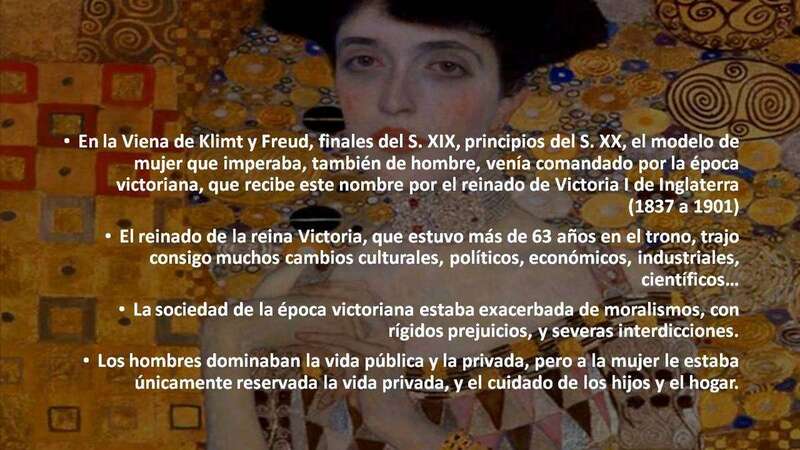 Con la exposición de imágenes que nos facilita la ponente Dra. Pino Lorenzo, se facilita la comprensión del papel de la mujer en la sociedad de estos años: “En la Viena de Klimt y Freud, años finales del siglo XIX y principios del XX, el modelo de mujer que imperaba, también de hombre, venía comandado por la época victoriana formas de vida social, relaciones y cultura que se desarrollaron durante el período del reinado de la reina Victoria I de Inglaterra, amplio período de 1837 a 1901, se extendió durante 63 años en el trono de Inglaterra, con los consiguientes cambios políticos, culturales, económicos, industriales, científicos, etc. Aunque la sociedad victoriana estaba plagada de moralismos, con rígidos prejuicios y severas interdicciones. Los hombres dominaban la vida pública y la privada, pero a la mujer le estaba únicamente reservada la vida privada, el cuidado de los hijos y el hogar”.