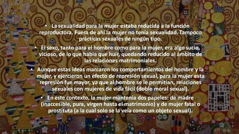 “En las primeras décadas del siglo XX la sexualidad en la mujer se reducía a la función reproductora. Fuera de ahí la mujer no tenía sexualidad. Por supuesto tampoco prácticas sexuales de ningún tipo. El sexo, tanto para el hombre como para la mujer, era algo sucio, vicioso de lo que había que huir, quedando reducido al ámbito de las relaciones matrimoniales. Estas ideas marcaron los comportamientos del hombre y de la mujer de la época, y ejercieron un efecto de represión sexual, sobre todo para la mujer, ya que al hombre se le permitían las relaciones sexuales fuera del matrimonio con mujeres de vida fácil. Es lo que se denomina la doble moral sexual. En este contexto la mujer mantenía dos papeles: de madre (inaccesible, pura, virgen hasta el matrimonio) y de mujer fatal o prostituta (a la cual solo se la veía como un objeto sexual). A la mujer no se la creía poseedora de deseo sexual, ni tan siquiera de deseo.