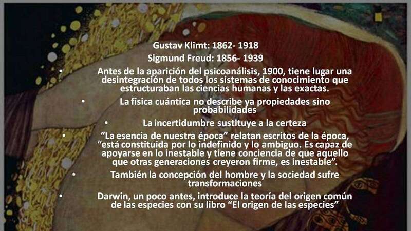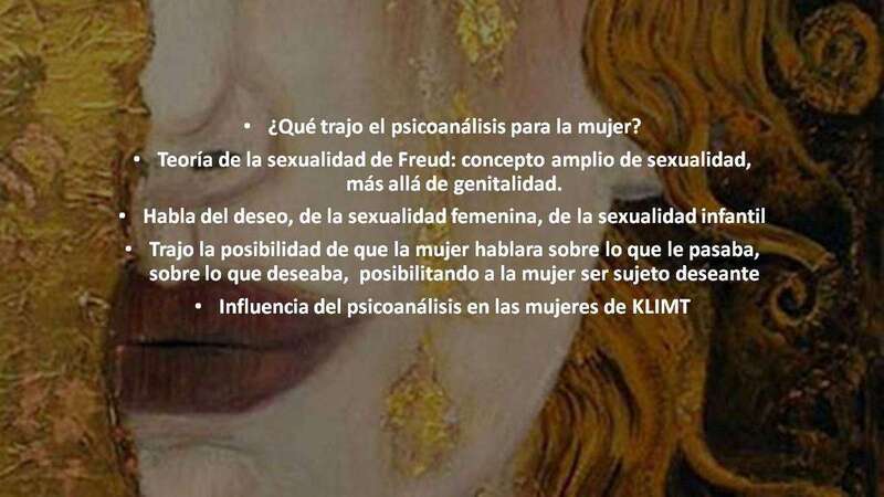 Con respecto a la sexualidad, el psicoanálisis introduce un concepto amplio de sexualidad, más allá de la genitalidad. Freud se adentró en el estudio de la sexualidad femenina y dio la posibilidad a la mujer de que hablara sobre aquello que le pasaba, sobre lo que deseaba. Esto fue un paso muy grande para la mujer. La mujer empieza a ser escuchada. El Psicoanálisis tuvo una influencia directa en las mujeres que retrata Klimt en sus cuadros, mujeres con deseo, que miran directamente al público, y que muestran sus cuerpos, su sexualidad, sin pudor”.