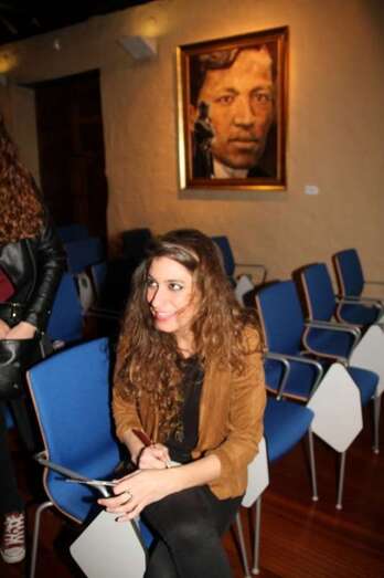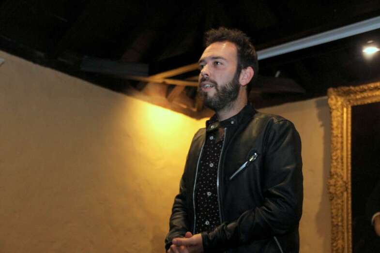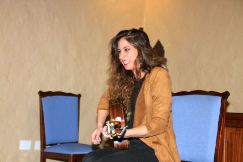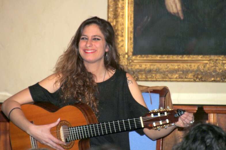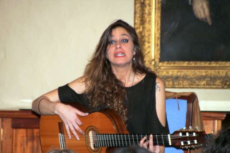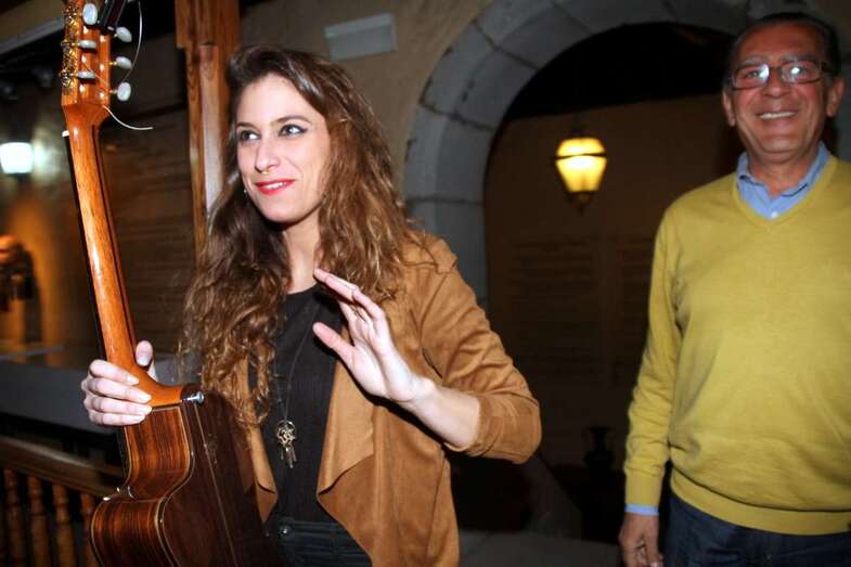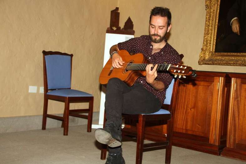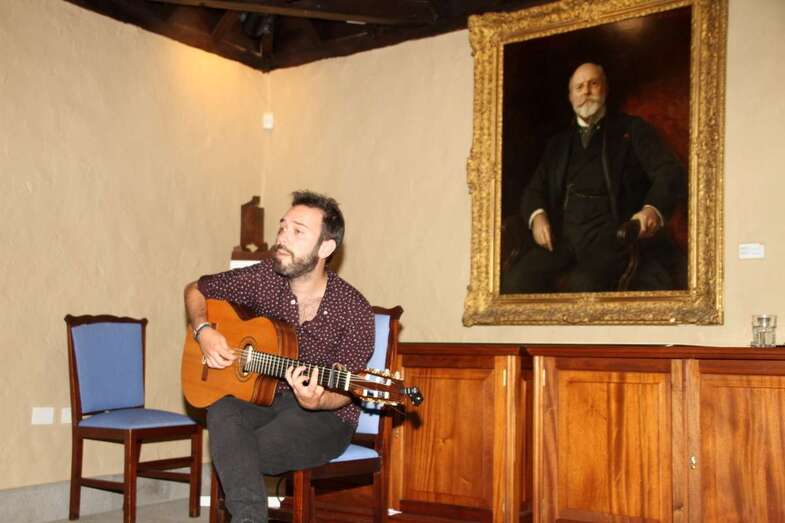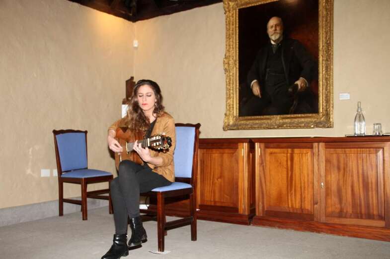 Sonrisa cautivadora a flor de labios y piel que conjuga perfectamente con su espléndida melena y mirada morena de ojos azabache que juegan al compas de las manos que, sobre el pentagrama de las cuerdas de su guitarra, se deslizan descifrando acordes, hablando en cada gesto de su canto y ganándose al público por su buen hacer en un escenario de historias seculares, por compañeros dos esculturas y un cuadro del prócer que da nombre a este recinto que acoge sus creaciones musicales.