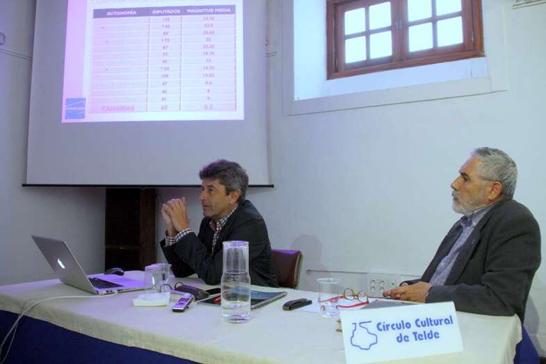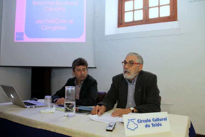 Interviene Vicente Mujica: “Muchas gracias al Círculo Cultural de Telde por la invitación. Llevamos muchos años trabajando por la Reforma Electoral Canaria. En una primera parte exponemos cómo funciona el sistema electoral canario, y en la segunda parte hablaremos del estado actual de los acuerdos que han llevado la Reforma Electoral del Parlamento de Canarias al Congreso de los Diputados. Hay un veto de un tercio de diputados que es posible ejercer y lo puede ejercer Coalición Canaria y Agrupación Socialista Gomera (ASG), para que en el Parlamento de Canarias esta reforma no se lleve a cabo. Afortunadamente, y de manera casual, porque no se ha dado en otras ocasiones, coincide en el tiempo también que en el Congreso de los Diputados está abierta la posibilidad de la reforma estatutaria, y ahí sí hay otras correlaciones de fuerzas que quizás permitan llevar adelante la reforma electoral.