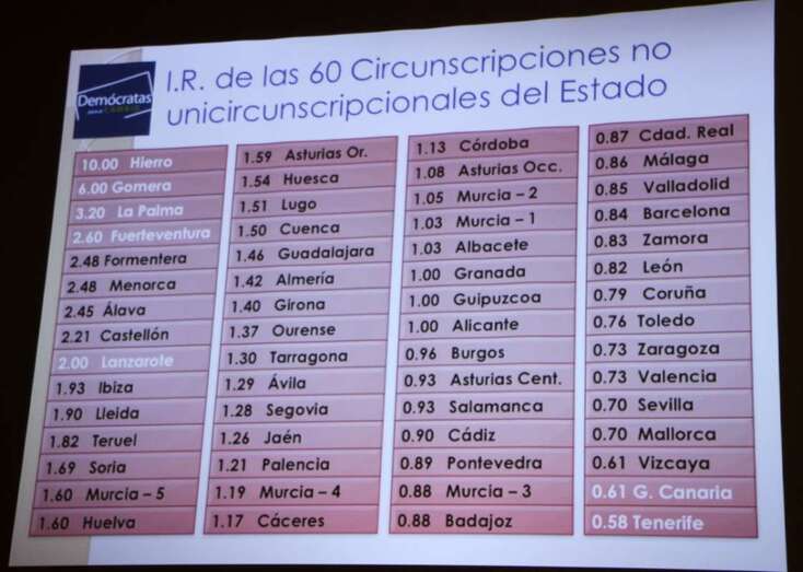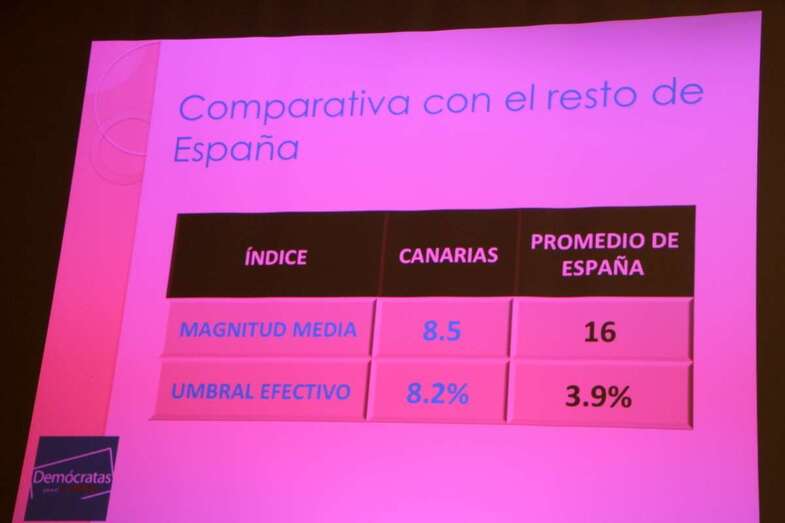Mujica en su completa y documentada exposición del funcionamiento del sistema electoral canario aborda la comparativa de magnitudes medias, umbral efectivo, promedio de diputados y de barreras, con el resto de España.