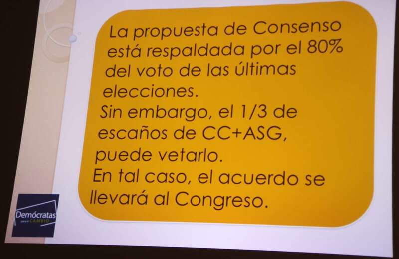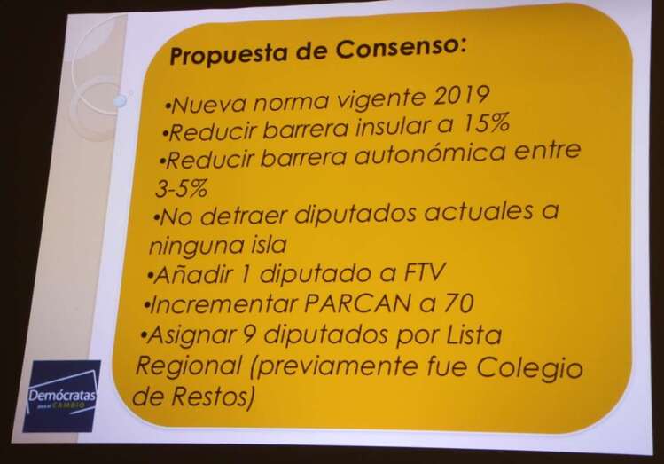 La propuesta de consenso lograda por el Partido Popular de Canarias, Podemos Canarias, Nueva Canarias y Partido Socialista Canario, abarca los siguientes elementos: que la aplicación de la nueva norma esté vigente en 2019; reducir la barrera insular al 15%, reducir la barrera autonómica entre 3-5%, no detraer diputados actuales a ninguna isla, añadir un diputado a Fuerteventura, incrementar PARCAN (Parlamento de Canarias) a 70 diputados, asignar 9 diputados por Lista Regional. Esta propuesta de consenso está respaldada por el 80% del voto de las últimas elecciones, sin embargo, el 1/3 de escaños de CC+ASG, puede vetarlo. En tal caso, el acuerdo se llevará al Congreso en las próximas semanas.