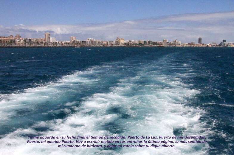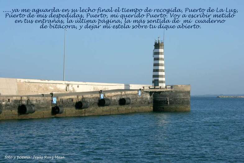 Ya me aguarda en su lecho final el tiempo de recogida,/ Puerto de La Luz, Puerto de mis despedidas, Puerto, mi querido Puerto./ Voy a escribir metido en tus entrañas, la última página, la más sentida,/ de mi cuaderno de bitácora, y dejar mi estela sobre tu dique abierto./ Aquí yacen mis sueños, aquí reposan, sextantes, olas y mareas,/ entradas y salidas, atraques, embarques, vigilancias y partidas,/ el recuerdo de los que en sus naves, a otros rumbos partieron,/ ¡capitán, guarde el buen recuerdo de su estancia y portuarias tareas!/ En este rincón isleño, alma marinera que eterna late en el refugio,/ al pie de las volcánicas Isletas, todos son guiados y acogidos,/ y en el vientre de la rectilínea dársena que yacente espera,/ la torreta del listado faro, la punta guiña su luminosa senda, son seducidos/.