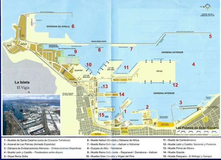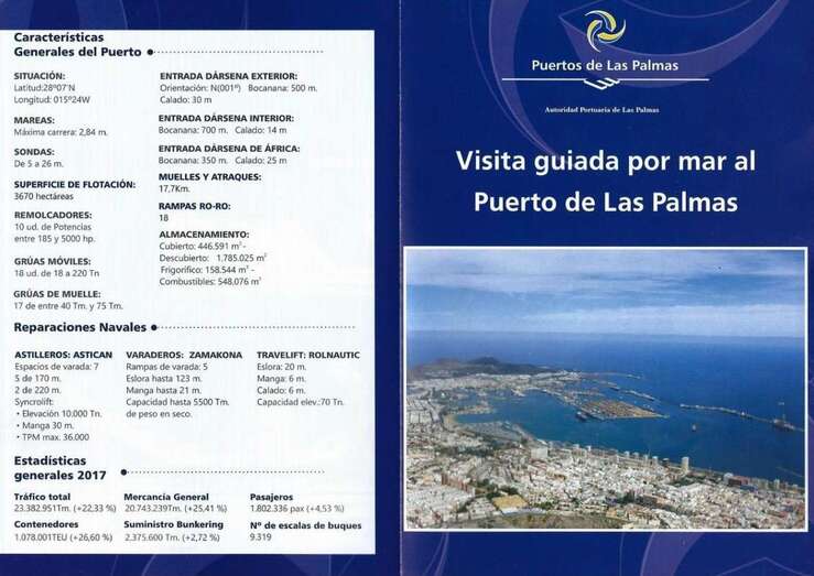 Para un mejor seguimiento de la ruta portuaria a seguir fue facilitado un díptico elaborado Puertos de Las Palmas, de la Autoridad Portuaria de Las Palmas. Según esta guía visionaríamos los 15 puntos principales que enmarcan las actividades y acciones portuarias. En este mismo folleto se describen las características generales del Puerto, Reparaciones Navales, y Estadísticas Generales del 2017.
