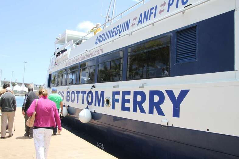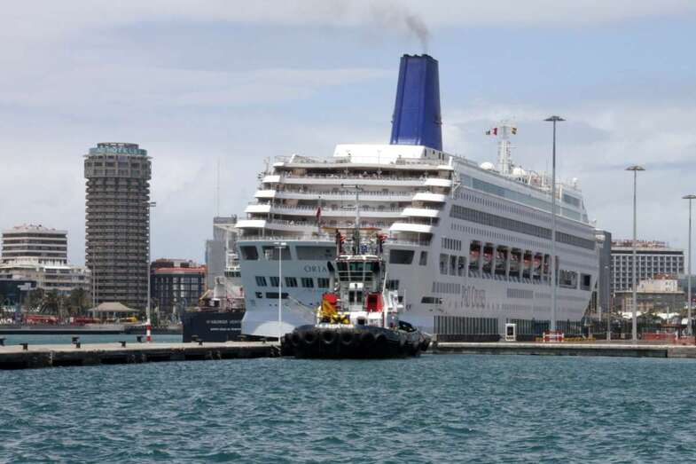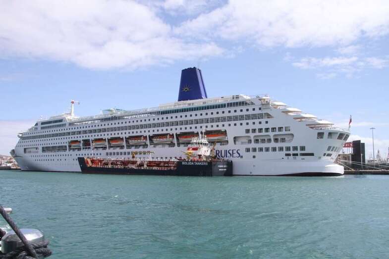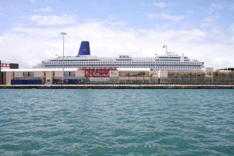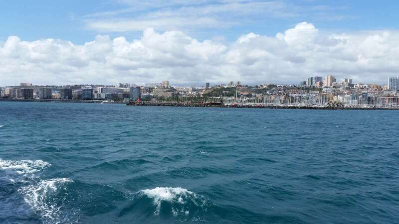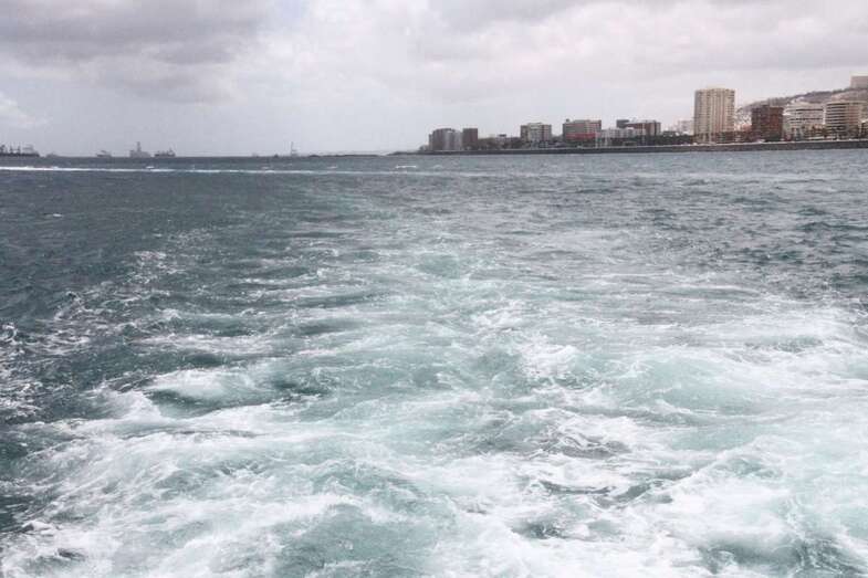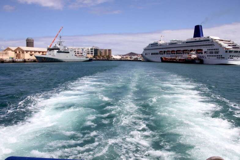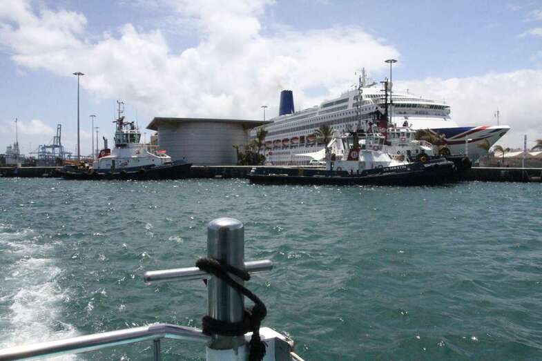 Desde el embarcadero del Muelle de Santa Catalina Sur a bordo del barco Blue Bird, catamarán componente de la Glass Botton Ferry, de la N. Cala Castell, con actividades turísticas especializada en paseos marítimos por la costa sur de la isla con trayectos por el litoral de Pasito Blanco, Arguineguín, Anfi, Puerto Rico, Mogán. En esta ocasión por las aguas portuarias de las dársenas del Puerto capitalino de La Luz. Se inicia la visita con rumbo sur hacia la bocana del Puerto dejando el Muelle Santa Catalina de poniente, zona de Cruceros Turísticos, donde permanecía atracado el crucero Oriana, de P&O Cruises, y el muelle del Arsenal dejando ver en su dique los buques de acción marítima BAM, Relámpago y Rayo.