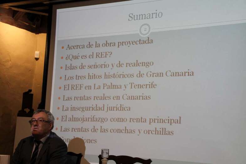 Ha dedicado mucho tiempo a la investigación histórica, de hecho cuando lo conocí fue en esta Casa Museo cuando él iniciaba  una investigación que dio como resultado un estudio sobre los pozos de la nieve en la cumbre de Gran Canaria, y ha desarrollado toda su labor desde entonces. Ha sido conferenciante, tiene diversos libros publicados basados en materia tributaria y en ciencias históricas. Es miembro de la Real Sociedad Económica de Amigos del País de Gran Canaria, de la Sociedad Científica El Museo Canario. Cuenta con una docena de libros y más de 50 artículos vinculadas a estas dos temáticas. Hoy nos imparte la conferencia “El Origen Histórico del Régimen Económico y Fiscal, Siglos XV y XVI”, que forma parte del primer tomo que se publicó en junio del pasado año 2017, y que forma parte de un gran proyecto de investigación que nos comentará. Muchas gracias”.