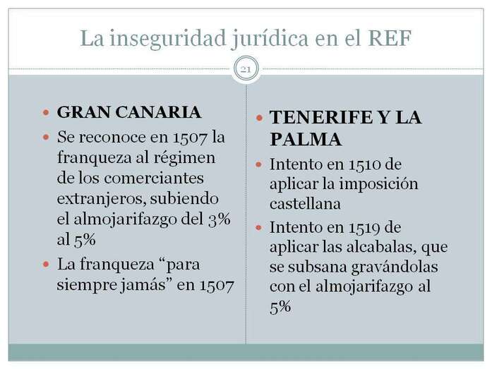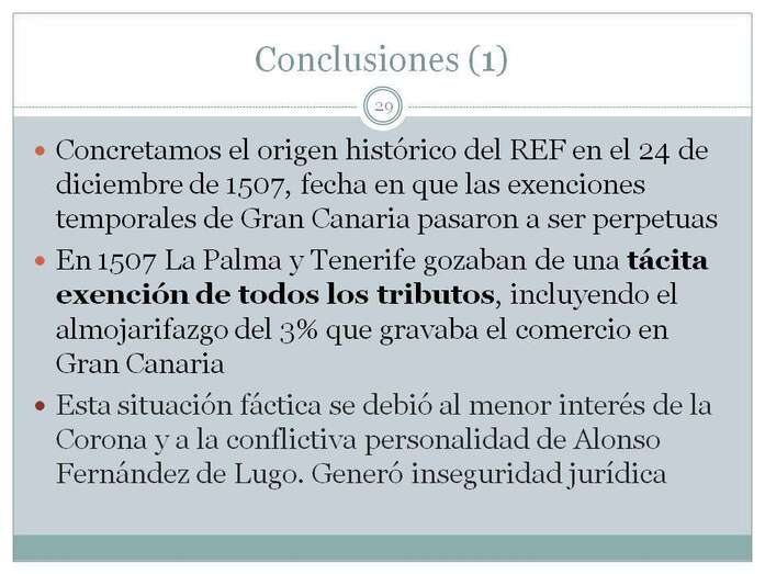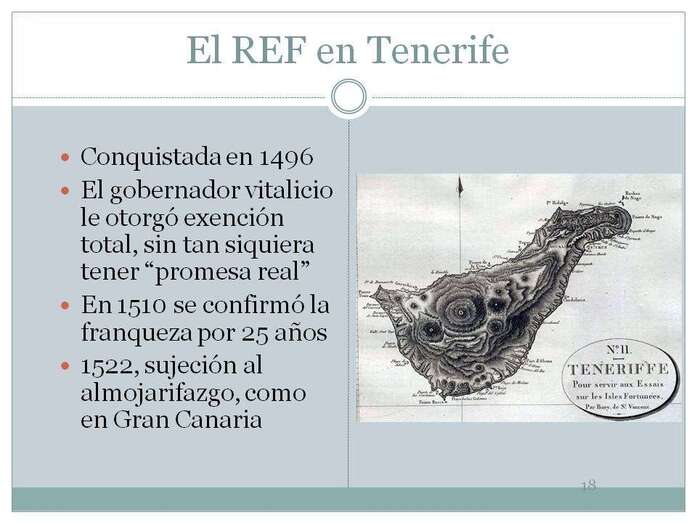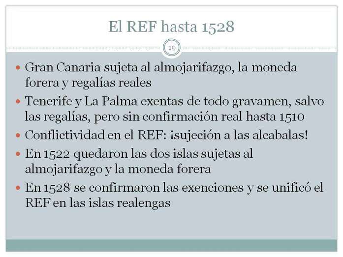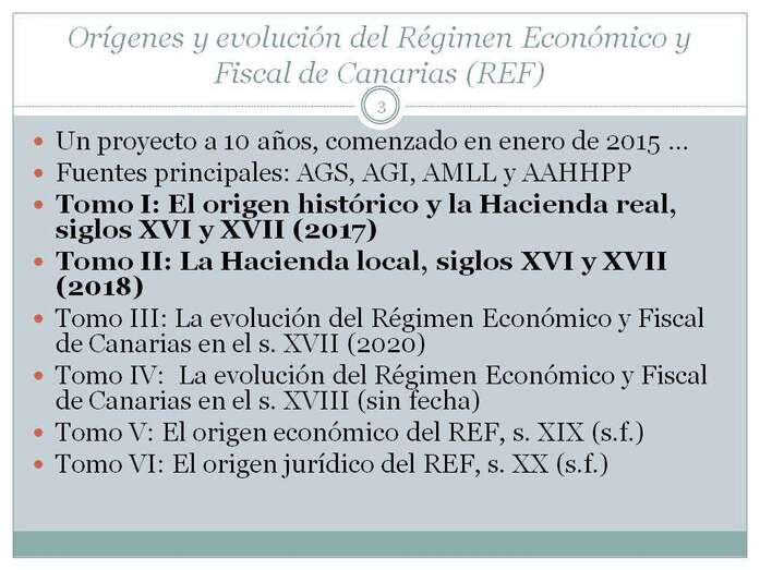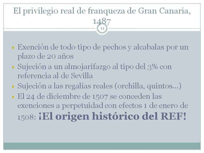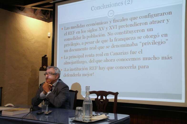 Estas son rentas que no han sido estudiadas hasta ahora y que lo hago con una parte importante de datos numéricos que he obtenido en el Archivo General de Simancas. Concreto el origen histórico del REF en una fecha, 24 de diciembre de 1507, fecha en la que la exención por 20 años a Gran Canaria pasa a perpetuidad. En esa fecha 1507, La Palma y Tenerife, gozaban de una tácita exención de todos los tributos, se lo había concedido su confiscador, el gobernador vitalicio, Alonso Fernández de Lugo, pero no los Reyes, e incluso no se les gravaba con el almojarifazgo al tipo del 3%. Esta situación fáctica degeneró en una falta de interés por parte de la Corona porque se había descubierto América.