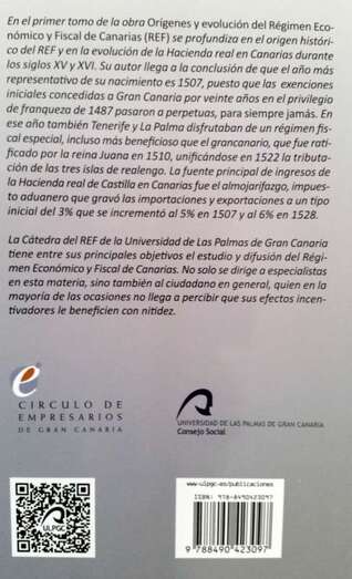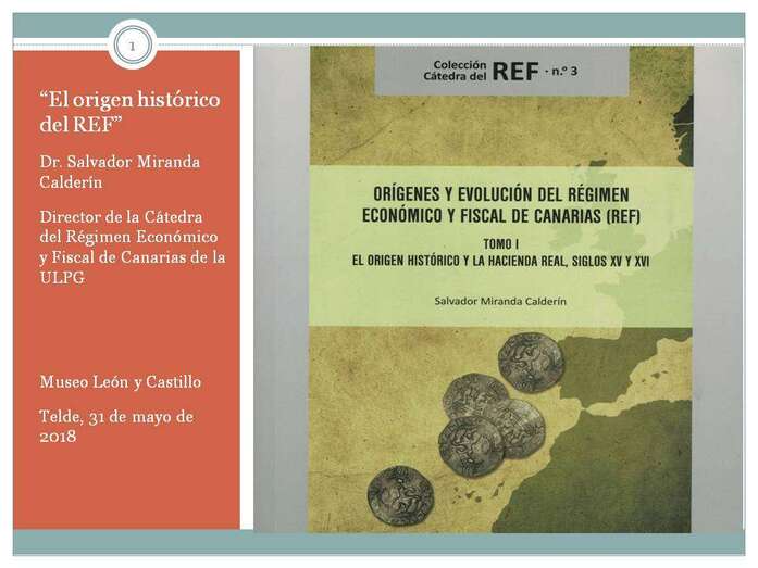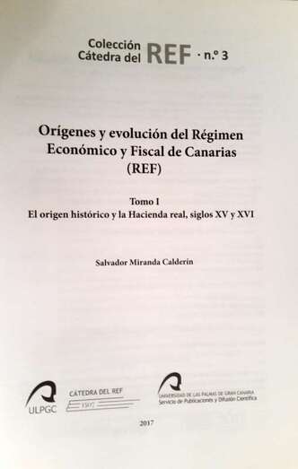 El autor de dicha obra, historiador, investigador y conferenciante, D. Salvador Miranda Calderín, después de hacer una exposición del acontecer histórico en las islas de Realengo, Gran Canaria, La Palma y Tenerife, en este Tomo I describe tres orígenes concretos. El histórico, inmediato a la Conquista de Gran Canaria en 1483, siglos XV y XVI, que es el contenido de este primer volumen El Origen Histórico y la Hacienda Real en los siglos XV y XVI, y de la ponencia a impartir. Fruto de otros estudios posteriores, un segundo origen, el económico, cuando en medio de una crisis económica, Bravo Murillo en 1852 aparece y desarrolla los Puertos Francos,  el origen económico del REF, y cuando aún no existía un texto legal, un texto jurídico, donde todas estas premisas se incorporaran, y esto se consigue en 1972, en el último tercio del siglo XX, el origen jurídico de nuestro Régimen Económico y Fiscal.