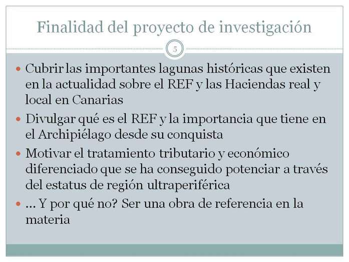 “La finalidad del proyecto de investigación, cubrir una serie de lagunas que yo, como historiador y como asesor fiscal especializado en esta materia veía que existía, divulgar qué es el REF y la importancia que tiene en el Archipiélago desde su Conquista, motivar el tratamiento tributario y económico diferenciado que se ha conseguido potenciar a través del status de región ultraperiférica, que es el gran paraguas que tiene Canarias. Existe un Tratado de funcionamiento de la Unión Europea con un artículo específico, el Artículo 359, que habla de la fiscalidad y de las ayudas de Estado que pueden recibir las regiones ultraperiféricas, ahí estamos nosotros. Del resto poco o nada tenemos. Y, por qué no, que lo que estoy haciendo sea una obra de referencia en la materia en todo lo concerniente al Régimen Económico y Fiscal de Canarias. Tengo que partir de una premisa ¿Qué es el REF? Si voy por la calle y pregunto a alguien ¿qué es el REF? no me contestan o no saben contestarme, y nosotros desde que nos levantamos por la mañana y encendemos la luz, ahí ya tenemos un coste diferenciado, porque el coste de la luz en Canarias sería muchísimo más alto si no existiese el Régimen Económico y Fiscal de Canarias. Cuando vamos a comprar el desayuno nos encontramos con una serie de productos que están subvencionados en Canarias para paliar esa diferencia en kilómetros que tenemos con respecto a la Metrópoli. No digamos si cojo el avión para ir a Tenerife, a La Palma o al Hierro, donde tengo una bonificación del 75%. Todo eso es el REF.