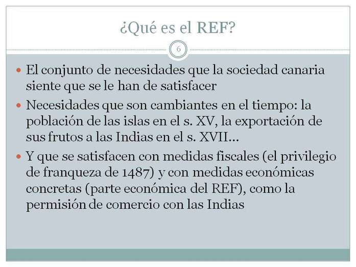 Si me preguntan qué es para mí el Régimen Económico y Fiscal REF, yo siempre respondo con la respuesta que dio el Tribunal Constitucional: Es el conjunto de necesidades que la sociedad canaria siente que se le deben resolver. Estas necesidades son cambiantes, hoy pueden ser unas, mañana pueden ser otras. Cuando los Reyes Católicos deciden conquistar las Islas, algunas estaban ya conquistadas. Las que estaban conquistadas eran las denominadas Islas de señorío, Lanzarote, Fuerteventura, La Gomera y El Hierro. Esas islas estaban conquistadas y pertenecían a su Señor en específico, algunas compartían Señores y otras pertenecían a otros.