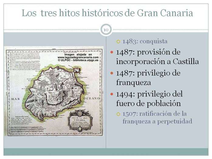 En cuanto al Régimen Económico y Fiscal de Canarias, se producen tres hitos históricos antes de que nazca el Régimen Económico y Fiscal. Gran Canaria se conquista en 1483, los vecinos estaban un poco preocupados porque no había una real cédula que otorgase a los grancanarios la virtud de ser súbditos de los Reyes Católicos. Entonces son los grancanarios los que solicitan pertenecer a la Corona, y en 1487, es cuando se da una provisión en que se incorpora Gran Canaria al Reino de Castilla, y por tanto se incorpora al Derecho Castellano, primer hito.