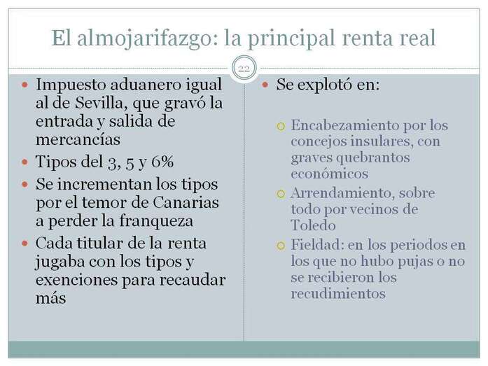 Si en Canarias no se aplican ningún tipo de pechos ni alcabalas, en cambio si se aplican una serie de Rentas Reales que iremos viendo, y la más importante de ellas es el almojarifazgo, de raíz árabe y que significa impuesto aduanero que graba el comercio de entrada y salida de géneros en el Archipiélago. Durante todo el siglo XV y hasta el último tercio del siglo XVI, la isla económicamente más importante de Canarias era Gran Canaria, ya a finales del siglo XVI, la isla económicamente hegemónica es Tenerife. ¿Qué ha pasado? Se ha hundido la industria del azúcar y ha florecido una nueva industria, la industria del vino. En Gran Canaria apenas se cultivan vides en aquella época, de tal forma, que incluso la isla de La Palma cuando se viene abajo la recaudación del azúcar, la industria del azúcar, incluso la isla de La Palma, supera en años específicos la recaudación del almojarifazgo respecto a Gran Canaria.