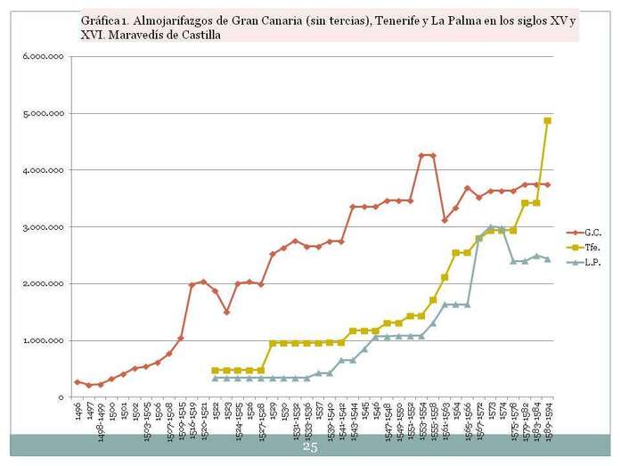 Los historiadores podríamos pensar que era así pero esto [la gráfica con las curvas de recaudación del almojarifazgo en las tres islas realengas  en el s. XVI] es una prueba objetiva de qué fue lo que sucedió a finales del siglo XVI. Gran Canaria pierde la hegemonía económica porque la industria del azúcar se viene abajo. Y ¿por qué se viene abajo la industria del azúcar? Por haber llevado la Corona la caña de azúcar al Caribe, que prohibió que se exportase a las Indias las vides. No se podía exportar la vid a las Indias. ¿Por qué no se prohibió exportar el azúcar? Fue el ocaso de la isla de Gran Canaria, que quedó con relevancia política, con relevancia institucional, pero de las tres islas luego en el siglo XVII, éramos la isla más pobre. En todo el comercio americano que estoy estudiando ahora para publicar el Tomo III, lo que me encuentro es que las denominadas permisiones, se solicitaban, 600 toneladas para exportar vino de Tenerife,  300 para La Palma, y 100 para Gran Canaria. Esta era la capacidad exportadora de la isla que fue la más importante en el siglo XVI, solo podíamos exportar 100 toneladas de vino, mientras que Tenerife exportaba 600, multiplicaba la producción por seis.